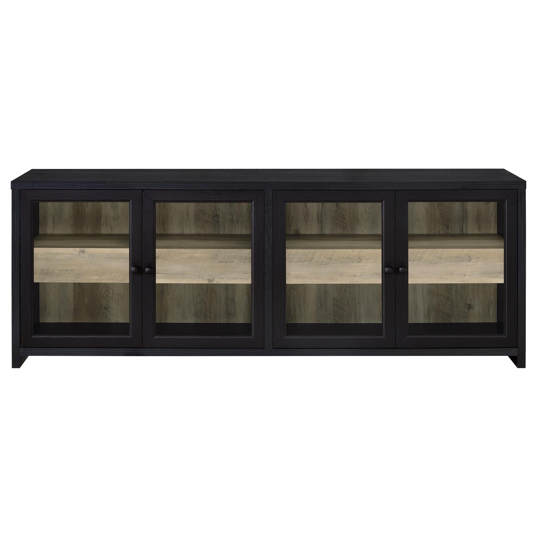This three-piece entertainment center brings bold character and quiet refinement to the modern living room. Framed in matte black with framed glass doors and a natural wood-look interior, it offers a striking contrast that feels both grounded and elegant. Adjustable shelving provides room to display, while hidden drawers and cabinets keep everyday items tucked neatly away. With its tall, architectural profile and warm two-tone finish, this ensemble transforms your media setup into a curated focal point. Key Features: • Entertainment center with black frame and light wood-look interior creates bold visual contrast • Four glass-front cabinet doors on the TV stand conceal spacious open shelving for electronics • Tall cabinets include adjustable upper shelves ideal for display or media storage • Lower compartments with framed doors offer enclosed storage for games, consoles, or décor • Constructed from engineered wood, tempered glass, and durable laminate veneer surfaces • Easily supports TVs up to eighty-five inches while adding vertical storage with a clean finish