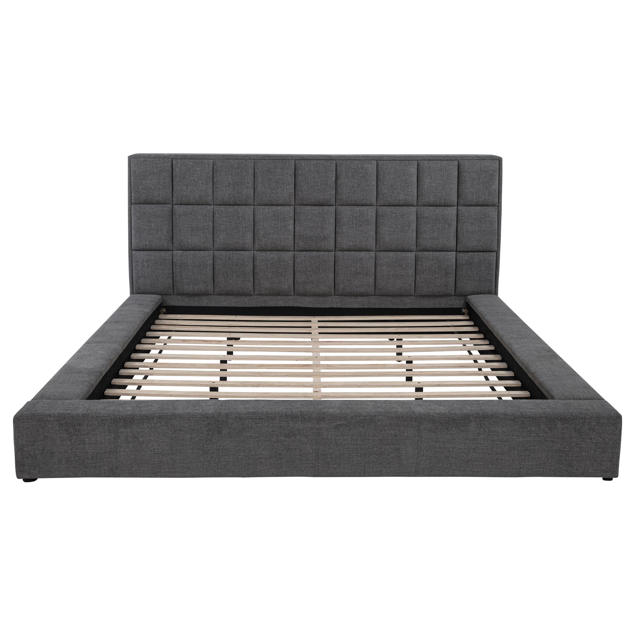 This innovative platform bed transforms the modern bedroom with bold style and hidden functionality. The oversized, square-tufted headboard conceals flip-up LED reading lights on each end and a drop-down center console with dual cup holders and storage for essentials. Wide side rails and a fully wrapped footboard offer sit-on ledges, while a supportive slatted platform eliminates the need for a foundation. Thoughtfully engineered and rich in features, this “Transformer Bed” redefines everyday comfort. Key Features: • Queen platform bed with oversized tufted headboard and sleek modern cream fabric upholstery • Flip-up LED lights built into headboard ends for convenient nighttime reading • Drop-down console at center of headboard reveals two cup holders and remote storage • Side rails and footboard include wide ledges designed for casual sitting • Mattress-ready platform includes thirteen slats, no foundation or box spring needed • Crafted from engineered wood, fabric, and foam for durable, long-lasting support