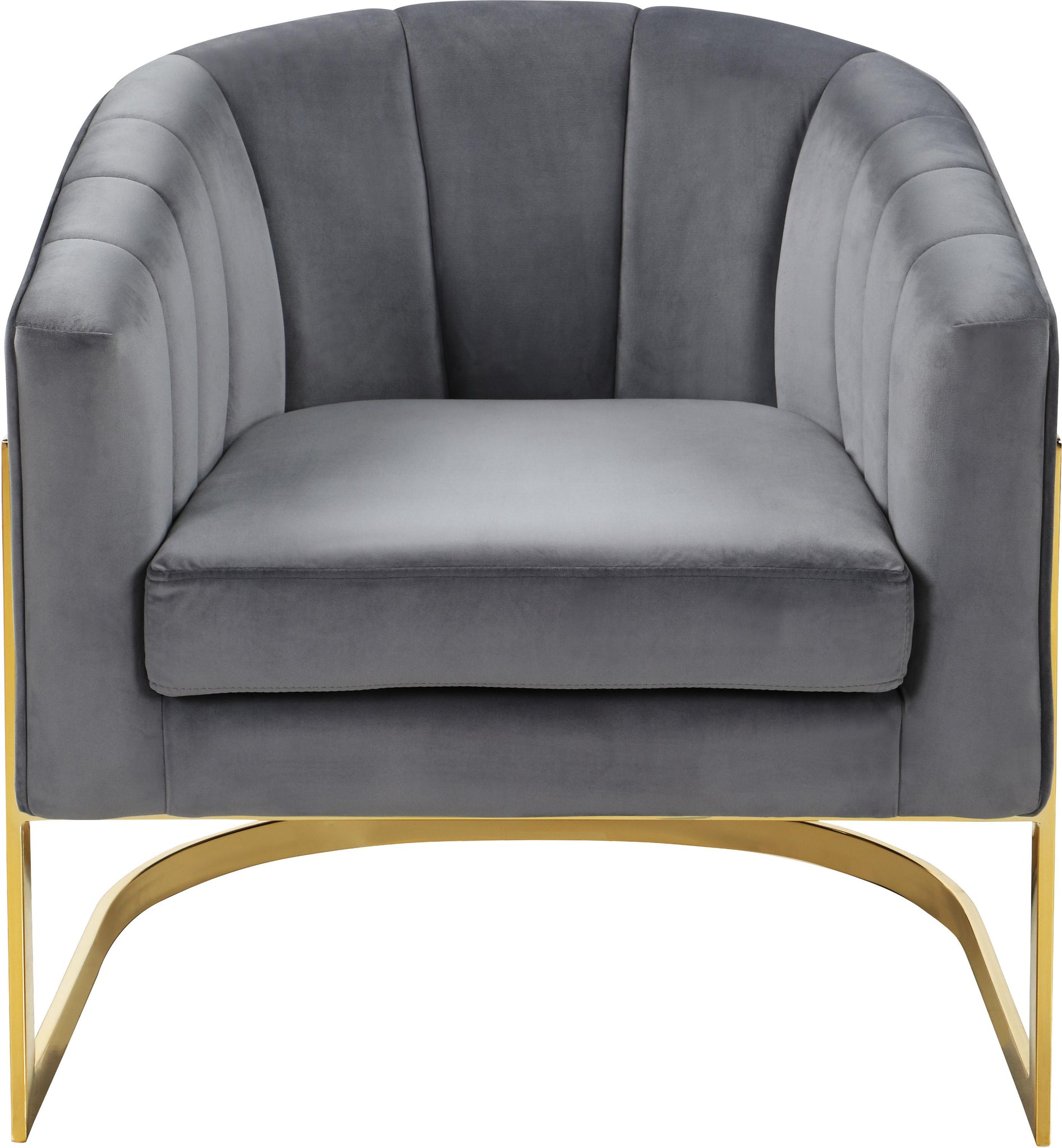 Add a touch of modern drama to your space with this Carter Grey Velvet Accent Chair from Meridian Furniture. This chair offers a super plush cushion that cradles your body in exquisite comfort as you sit, making it easily become your favorite spot in the house. Tufted channels on the arms and back add a textured feel to the chair, and it's upholstered in grey velvet, so it's soft and supple against the skin. The stainless steel base is finished in gold, adding to its elegant demeanor for your modern home.