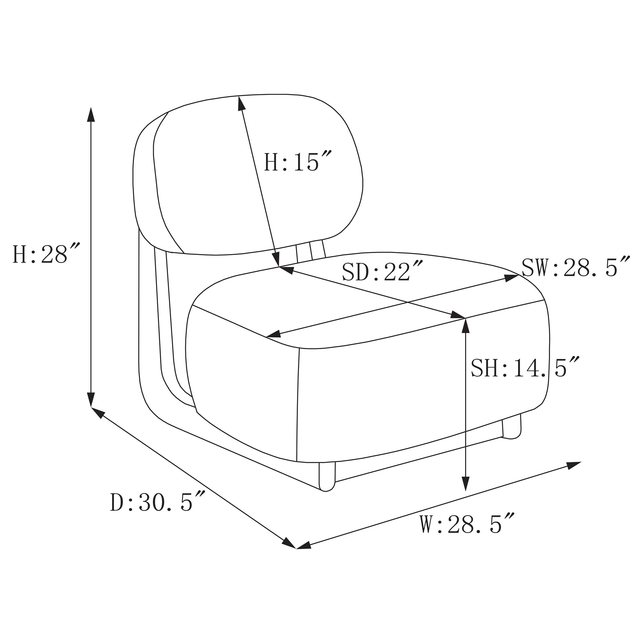 Change up the look and feel of your living room with the addition of a modern accent chair. It's an armless design with slipper chair inspirations, updated for a contemporary home. The chair features a legless silhouette with just a slim horizontal support structure underneath a thick seat cushion. Its oval back adds support, with an open design that lightens the look of the chair. A black finish on its supports completes the crisp, compelling design to perfection.
