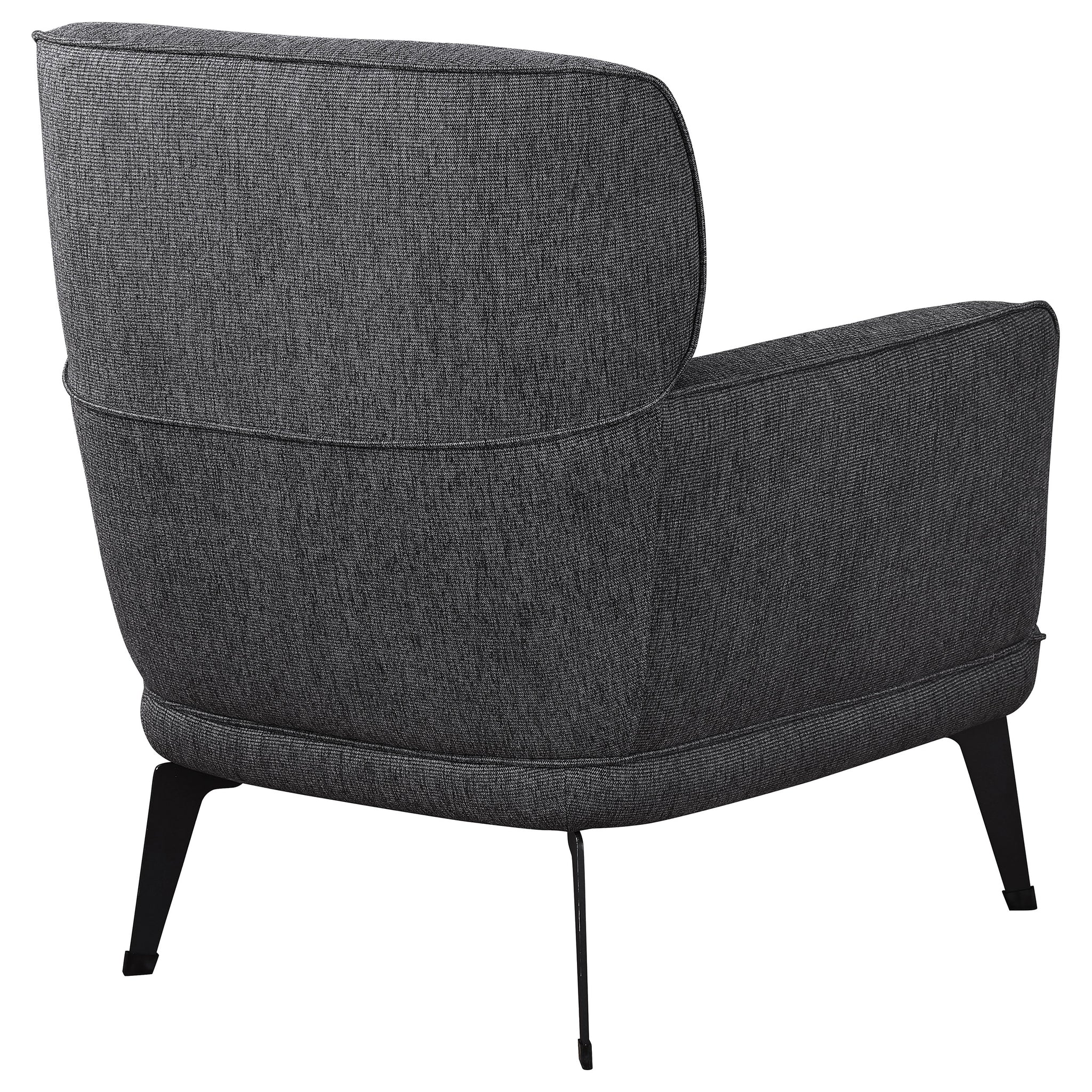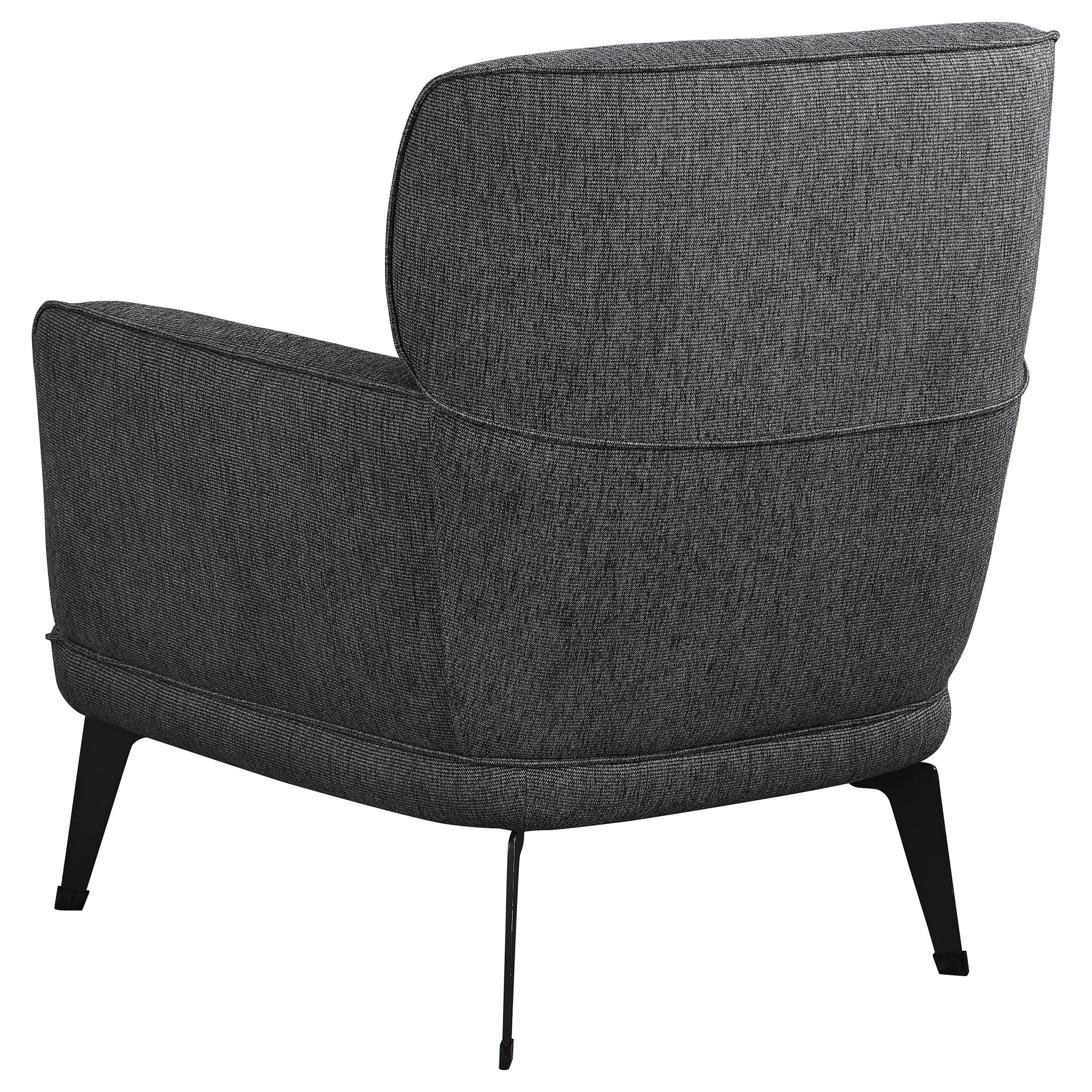 Check all the boxes for a comfortable and stylish addition to your living space. This chic accent chair reflects the best of both modern and transitional style elements. Gorgeous upholstery covers a chair made of wood products and padded with foam to create a luxurious seating experience. Rounded track arms and a deep non-removable seat cushion embellish the design of a chair that coordinates with a sleek seating group or sits alone in a library or bedroom. Set atop chic black metal legs, this chair becomes a favorite spot for stylish relaxation. Key Features: • Chic accent chair with modern and transitional style elements, upholstered in luxurious fabric, rounded track arms, deep non-removable seat cushion, and black metal legs • Wood products and foam padding create a comfortable seating experience • Coordinates with a sleek seating group or stands alone in a library or bedroom • Gorgeous upholstery and chic black metal legs make this chair a stylish addition to any living space • Rounded track arms and deep non-removable seat cushion embellish the design