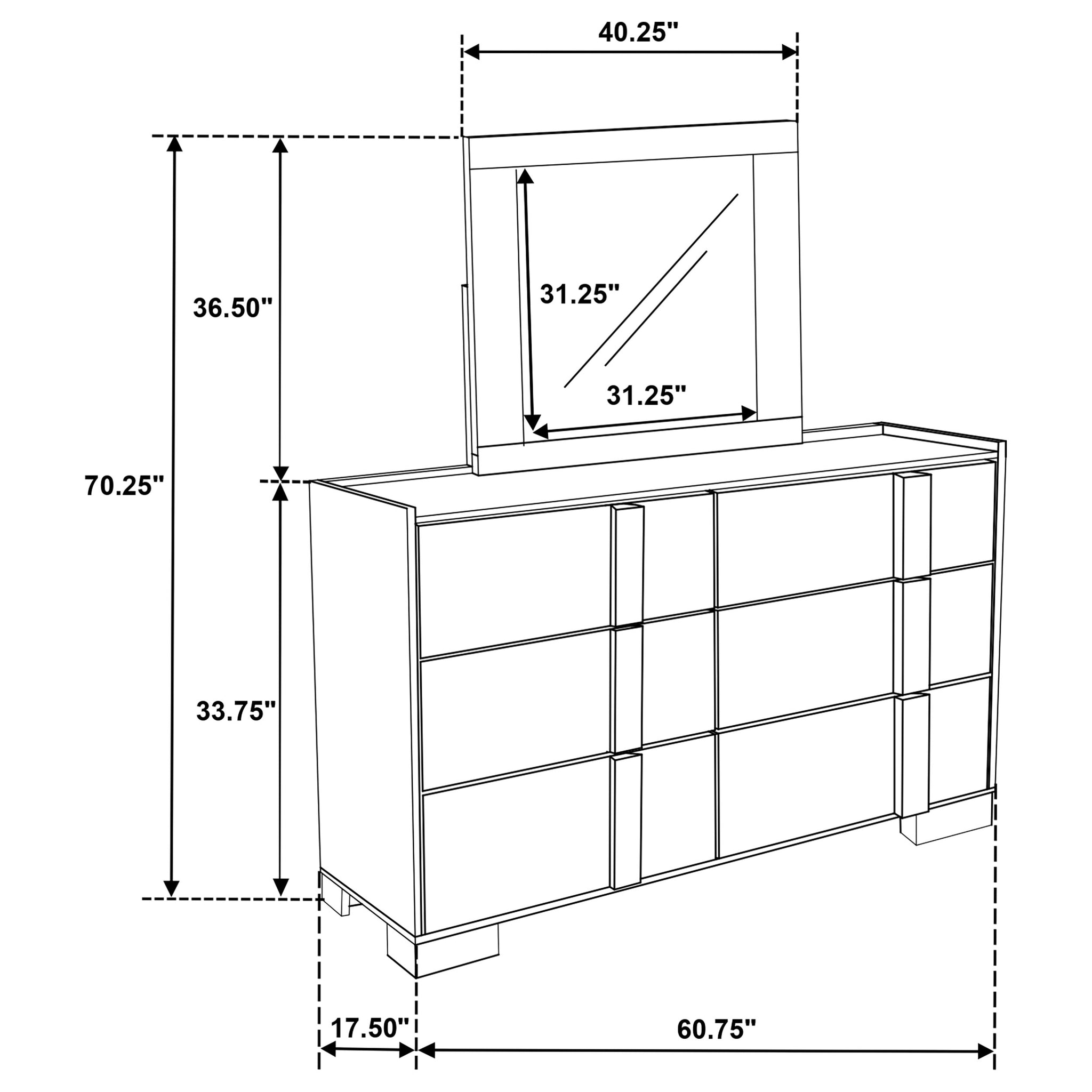 Elevate your bedroom decor with this stunning dresser and mirror set, combining contemporary elegance with functional design. Inspired by modern Italian aesthetics, this set features a sleek dresser with six spacious drawers and a matching mirror, both crafted from durable, easy-care melamine in a sophisticated blend of natural wood tones and crisp white panels. The dresser’s drawers, equipped with metal extension glides and pin-construction joinery, offer smooth operation and ample storage for your clothing and accessories. The minimalist mirror enhances the overall aesthetic, reflecting light and adding depth to your space. Transform your bedroom into a serene retreat with this harmonious and stylish dresser and mirror set. Key Features: • Dresser and mirror set for a cohesive bedroom look • Dresser crafted with durable, easy-care melamine in a sophisticated 2-tone effect • Six spacious drawers with metal extension glides and pin-construction joinery • Mirror designed to enhance the dresser’s aesthetic, reflecting light and adding depth • Blends natural wood tones and crisp white panels for a modern, elegant appearance