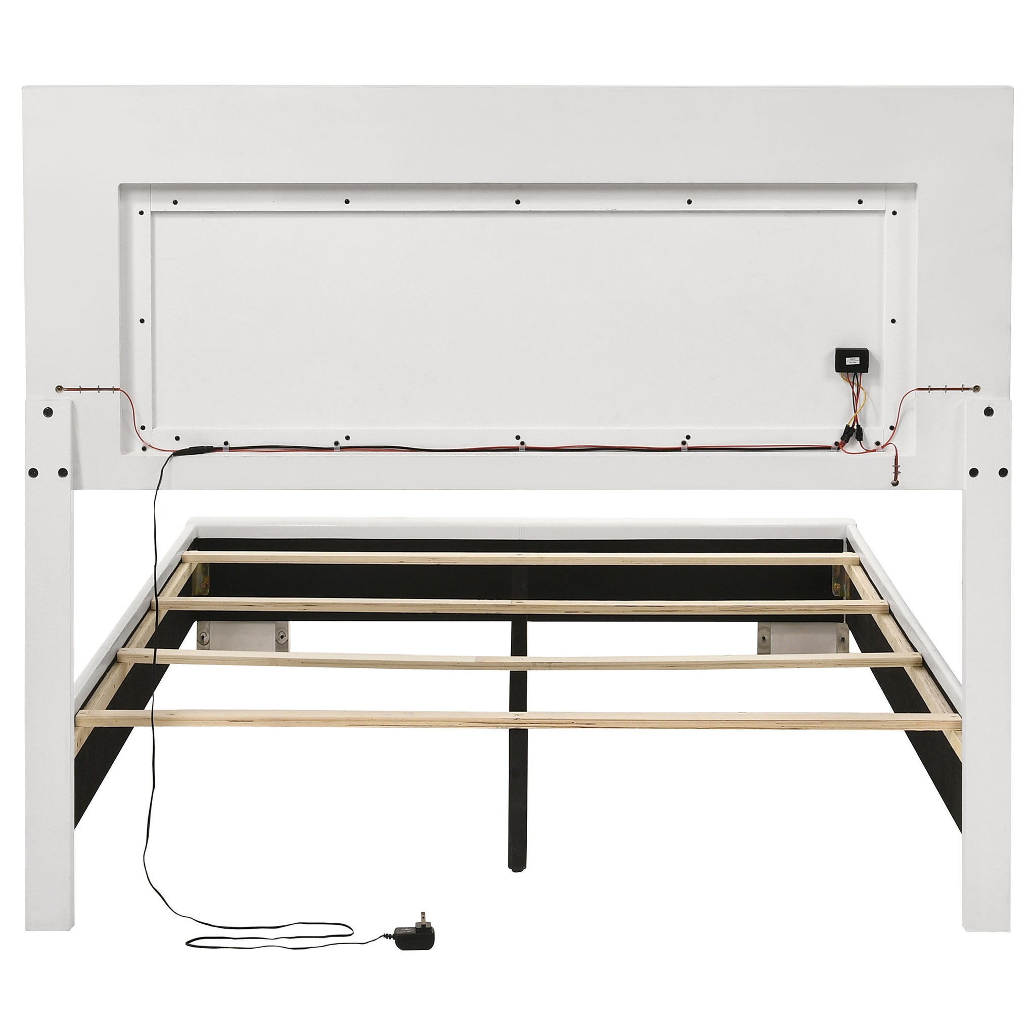 Illuminate your bedroom with the modern design of this LED bed. The headboard features a sleek white high gloss frame with built-in blue LED lighting, operated by a touch switch for convenience. The bed frame is upholstered in smooth white faux leather, enhancing its contemporary appeal. Designed for style and comfort, this bed brings a striking yet functional centerpiece to your space, blending modern aesthetics with subtle ambient lighting. Key Features: • Panel bed featuring a sleek, modern LED headboard design • White high gloss headboard frame with built-in blue LED lighting strip • Touch-activated switch provides effortless LED illumination control • Bed frame upholstered in smooth and durable white faux leather • Sturdy construction ensures lasting support and structural integrity • Contemporary design blends stylish aesthetics with ambient lighting effects