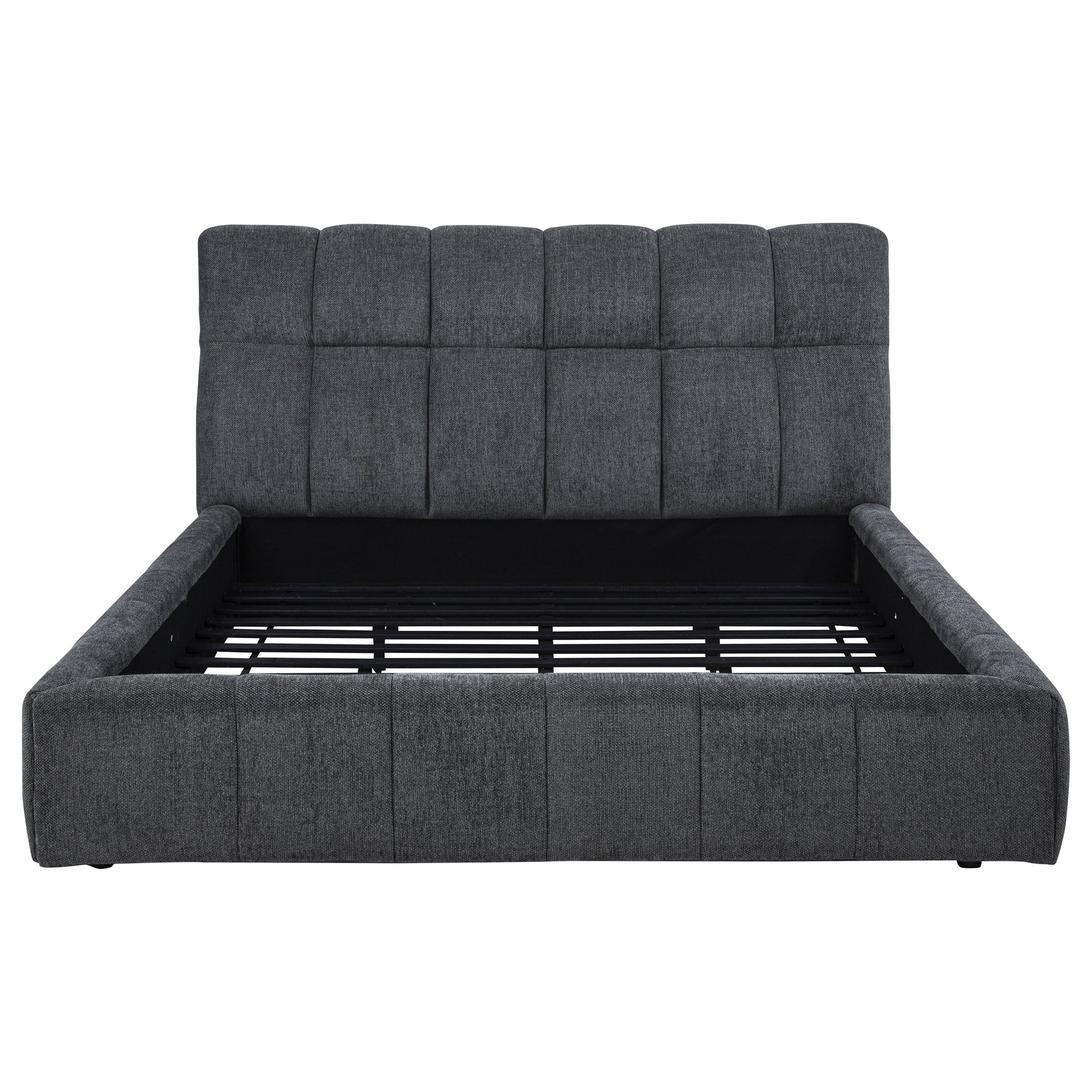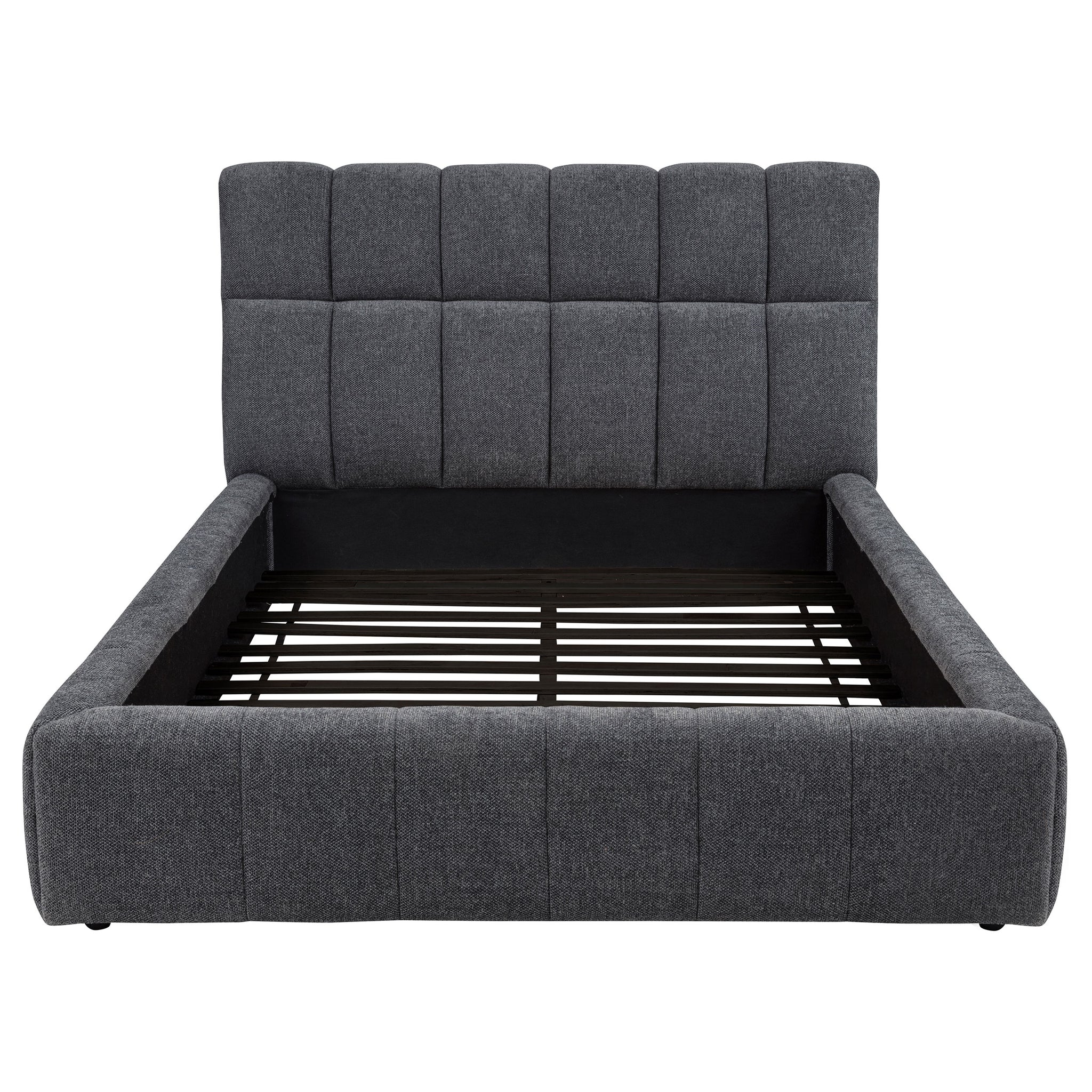 Tailored with bold lines and soft texture, this upholstered platform bed blends comfort with quiet strength. Vertical channel tufting runs along the headboard and foot rails, adding dimension and rhythm to the silhouette. Wrapped in plush fabric and fully slatted for support, it eliminates the need for a foundation. Crafted from solid and engineered wood, this bed invites modern serenity into any bedroom retreat. Key Features: • Queen platform bed with vertical tufting for subtle texture and visual rhythm • Cream fabric upholstery adds soft elegance with a light, airy modern palette • Slatted platform design supports mattress without needing a foundation • High headboard offers sculptural depth and a softly framed silhouette • Crafted from solid pine, engineered wood, and foam for strength and support • Perfect for minimalist or contemporary rooms with light, calming tones