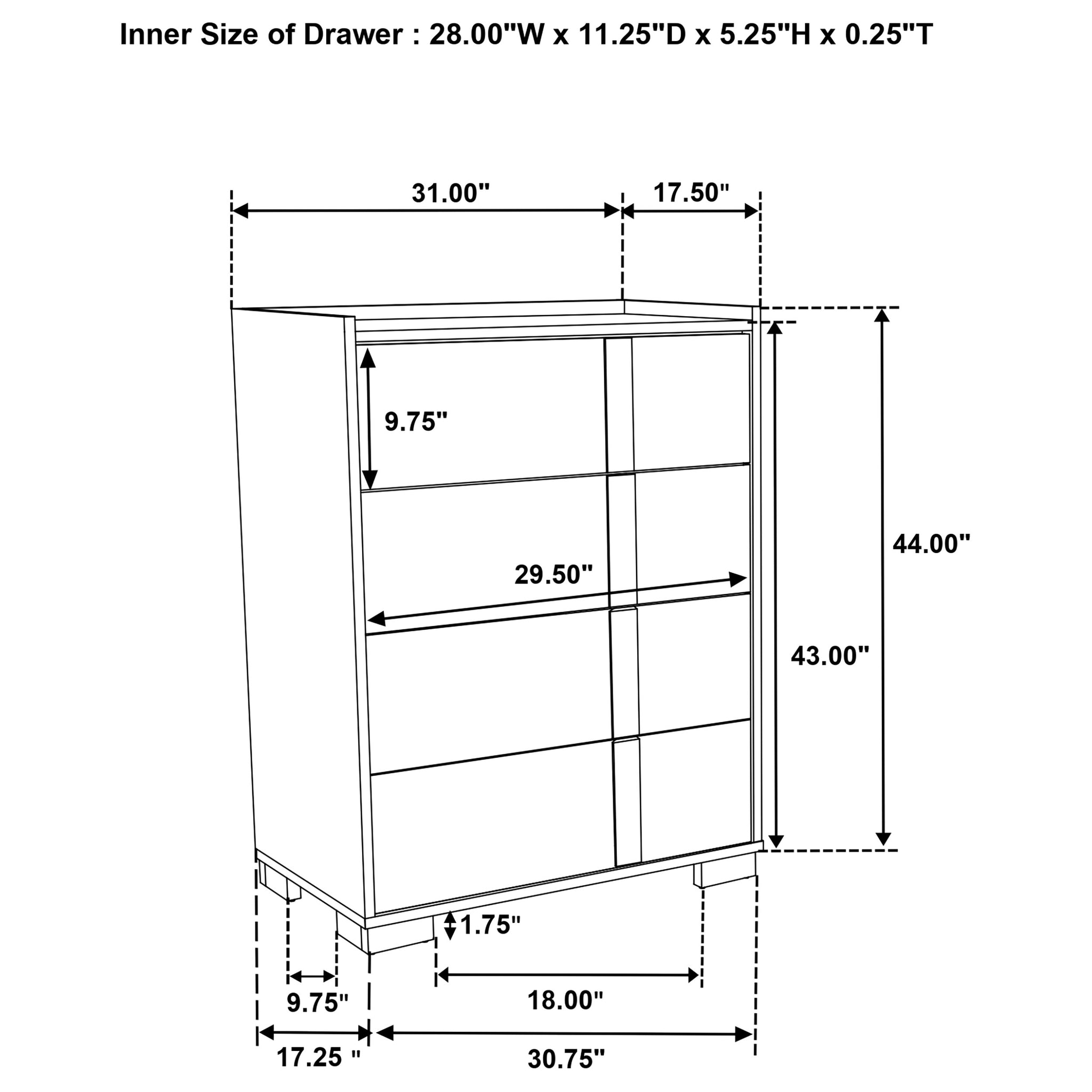 Transform your bedroom into a haven of modern elegance with this exquisite bedroom set. Inspired by contemporary Italian design, each piece in this collection features a sophisticated blend of natural wood tones and crisp white panels, crafted from durable, easy-care melamine. Whichever configuration you choose, this set offers a harmonious blend of style and functionality. The bed, available in both queen and eastern king sizes, is complemented by a matching nightstand, dresser, dresser mirror, and optional chest. Elevate your home decor with this cohesive and stylish set, designed to bring both beauty and practicality to your space. Key Features: • Queen bed features integrated LED touch lighting on the headboard for a serene ambiance • Durable, easy-care melamine construction in natural wood tones and white panels for a modern look • Dresser and nightstand provide ample storage with smooth metal extension glides and pin-construction joinery • Mirror enhances the room’s aesthetic by reflecting light and adding depth • Contemporary Italian-inspired design brings elegance and functionality to your bedroom
