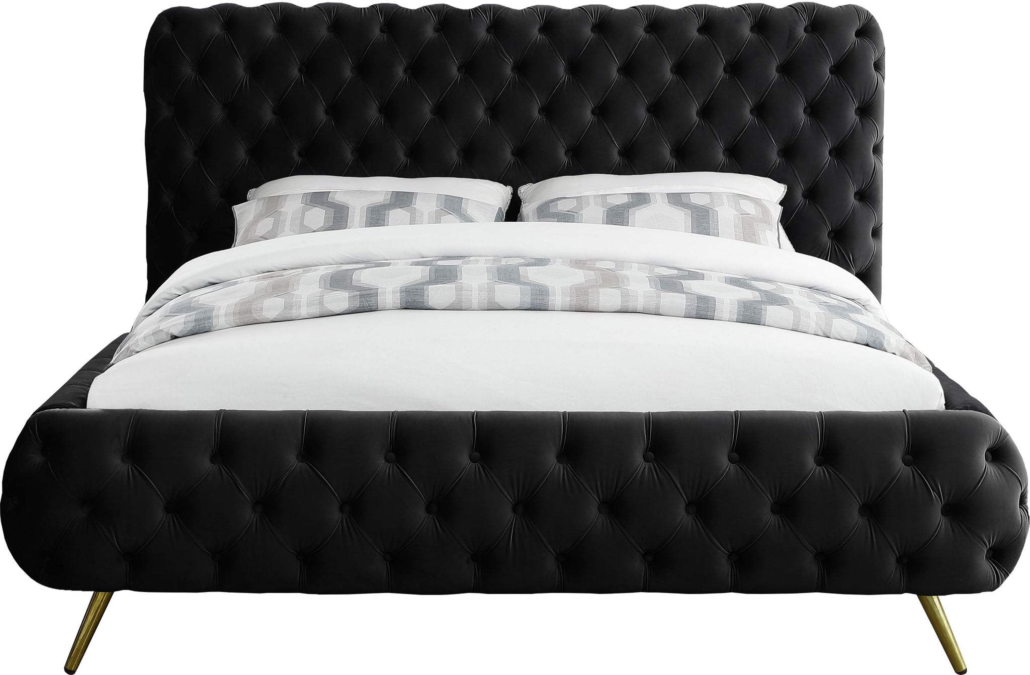 Surround yourself in modern luxury when you add this Delano Black Velvet Queen Bed to your bedroom oasis. Sumptuous by design, this bed features all-over button tufting for a look that is nothing short of stunning. This dimensional bed features a heavily padded headboard and side rails, each covered in magnificent-to-the-touch black velvet for a look that's upscale and simply divine. Metal legs on this bed allow easy clearance for vacuuming, and the bed uses just a mattress, so there's no need for a box spring or foundation, which only adds to its sleek look.