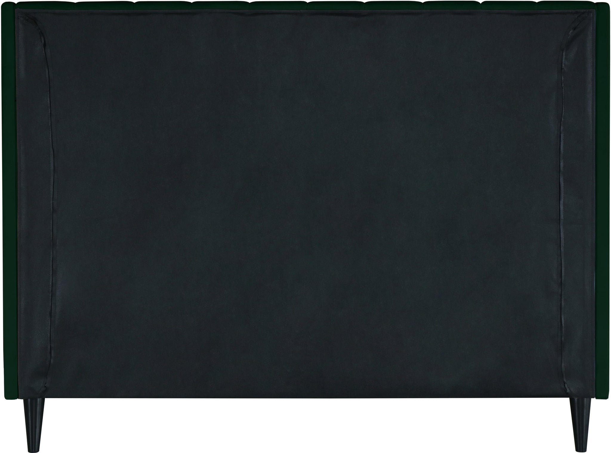 Snuggle up to a pet or other loved one in this richly upholstered Eva green velvet king size bed for the ultimate in rest and relaxation. The wing back headboard has cushioned vertical deep channel tufting, and both the side rails and footboard are upholstered too for your comfort. Tapered black wood legs match the upholstery and support this contemporary bed, elevating it sufficiently that you can store items underneath.