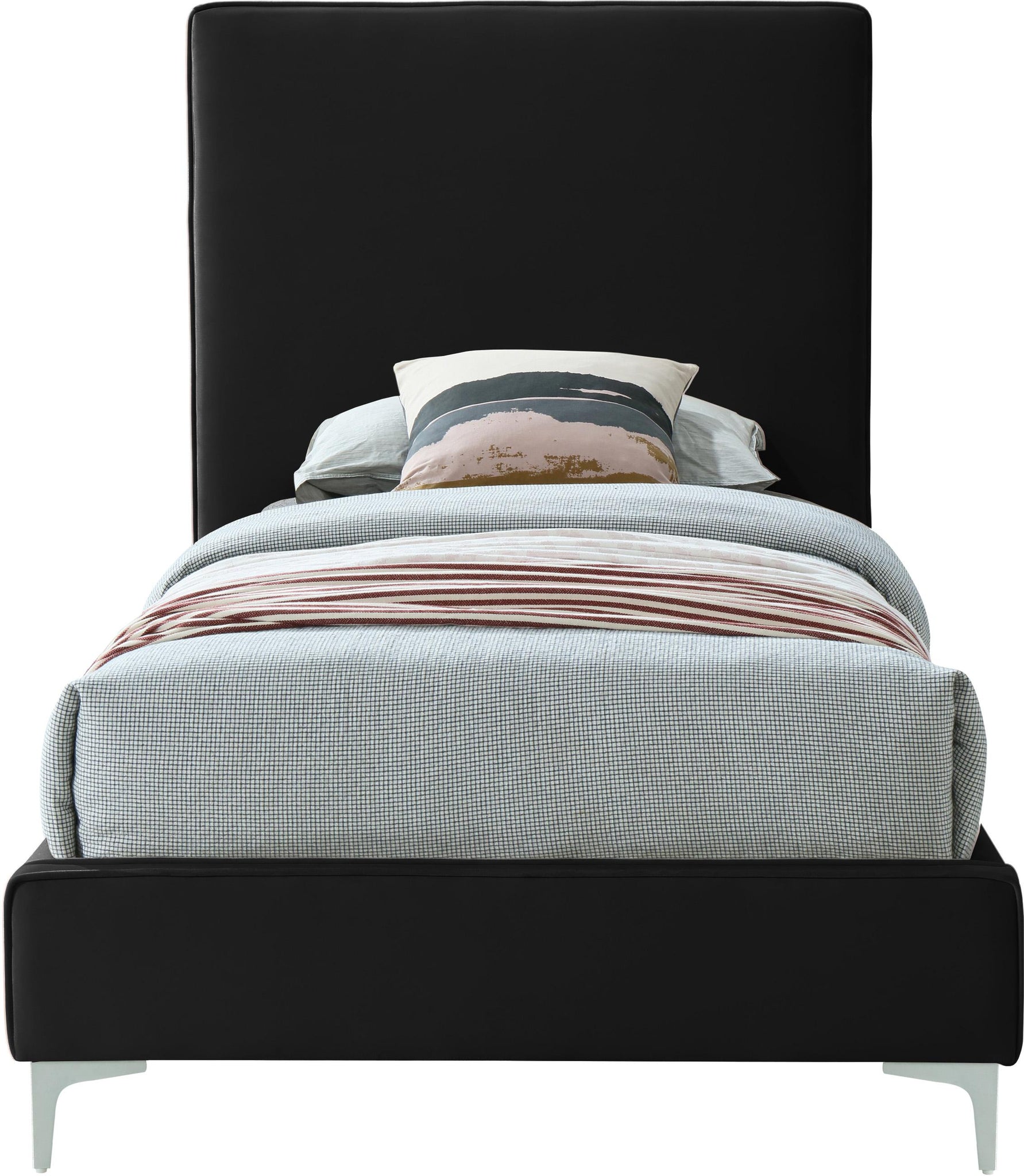 Provide yourself with a few options when you choose the sleek Geri black velvet twin size bed. The headboard, side rails and footboard are all cushioned and upholstered, with snazzy decorative piping on the headboard and footboard. This bed comes with two different sets of legs so you can match your other d?�cor. Use the gold ones, the chrome ones, or two of each color for a truly contemporary approach.