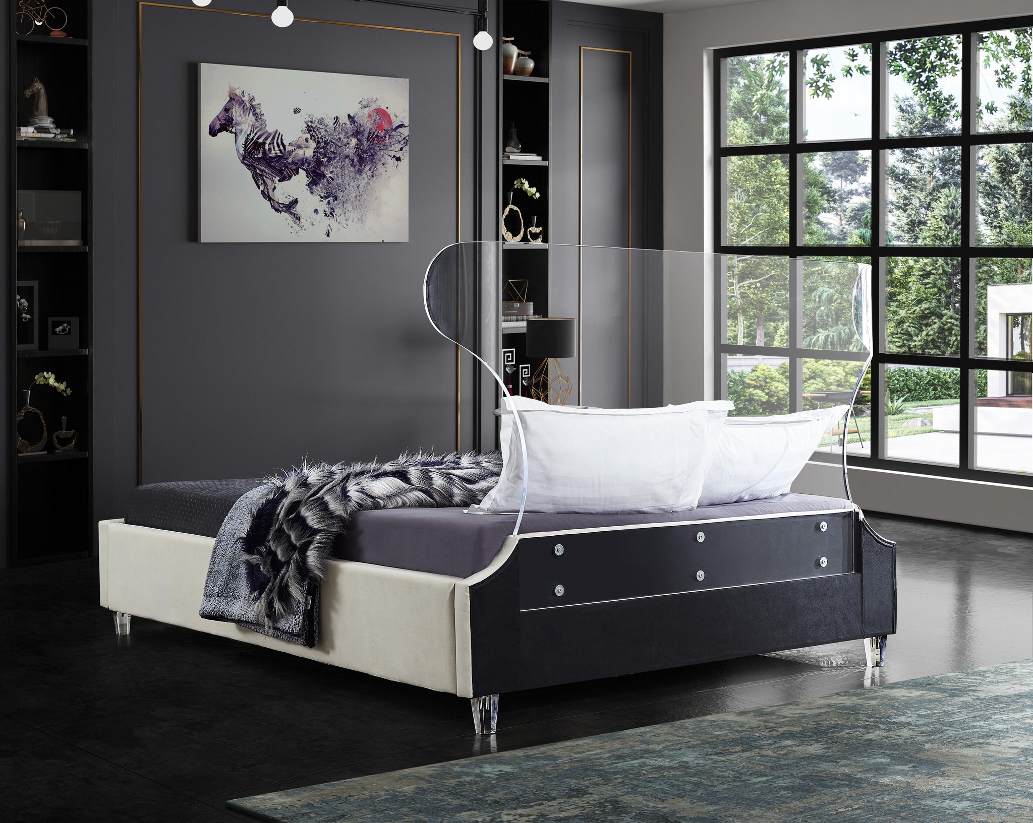 There's nothing scary about the Ghost cream velvet full size bed, with its plush cushioned and upholstered side rails and footboard. A curved transparent acrylic headboard allows you to situate it in front of a window without blocking the view, and matching acrylic legs offer a beautiful contemporary appearance. This bed has a complete set of slats included for your convenience, so you won't need to purchase a box spring.