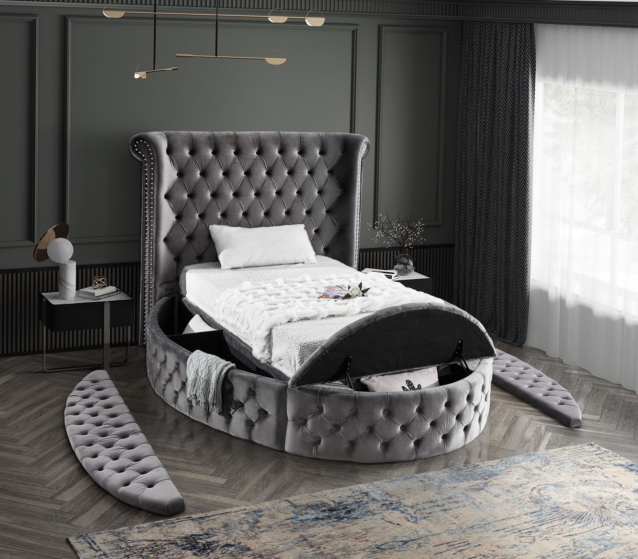 Marvel at the remarkable beauty and graceful lines of this round Luxus grey velvet twin size bed. The headboard, footboard and side rails are all adorned with deep button tufting, and there is nailhead trim on both sides of the tall headboard. The footboard and side rails all contain ample storage and seating, making it easy to sit down in comfort so you can put on your pants or shoes.