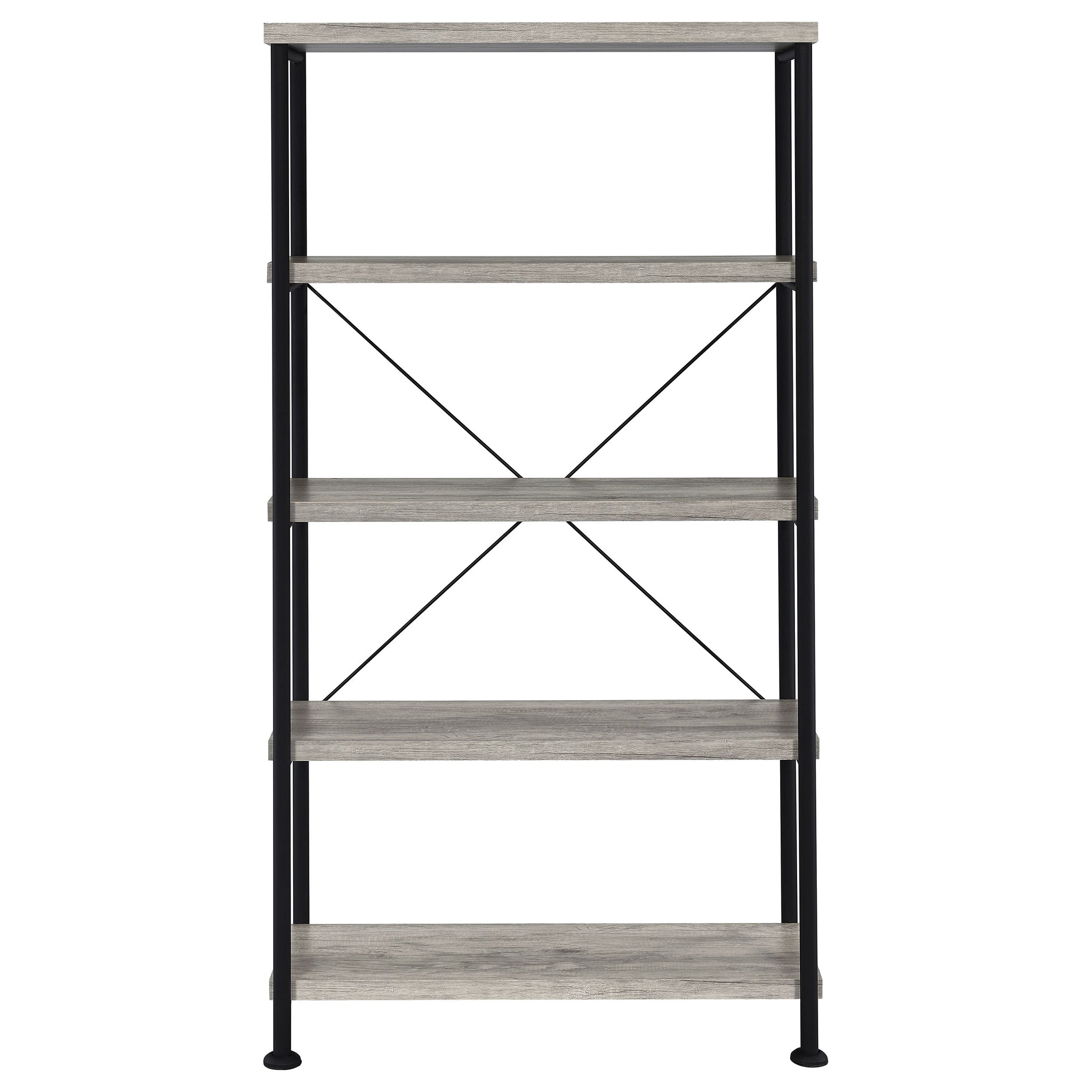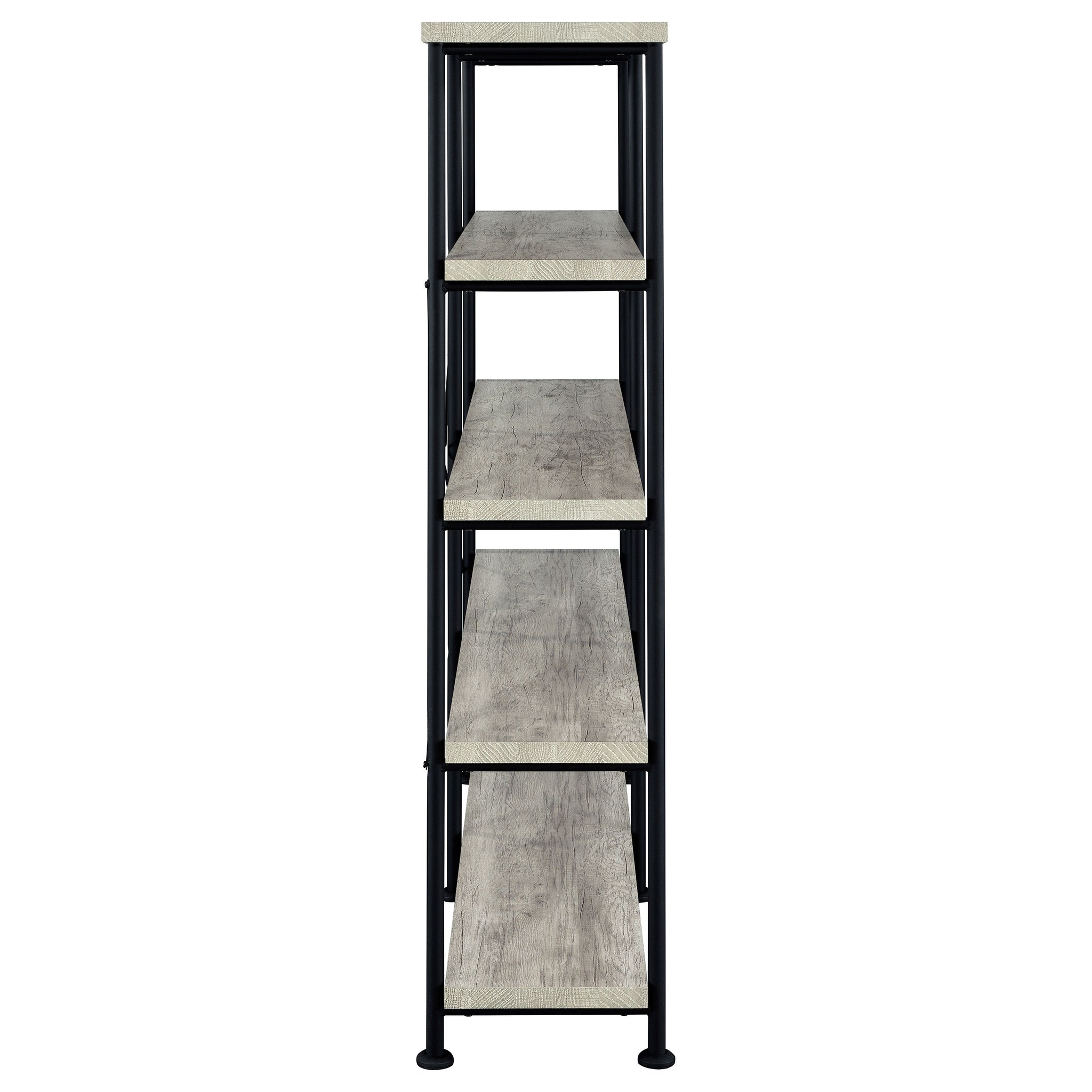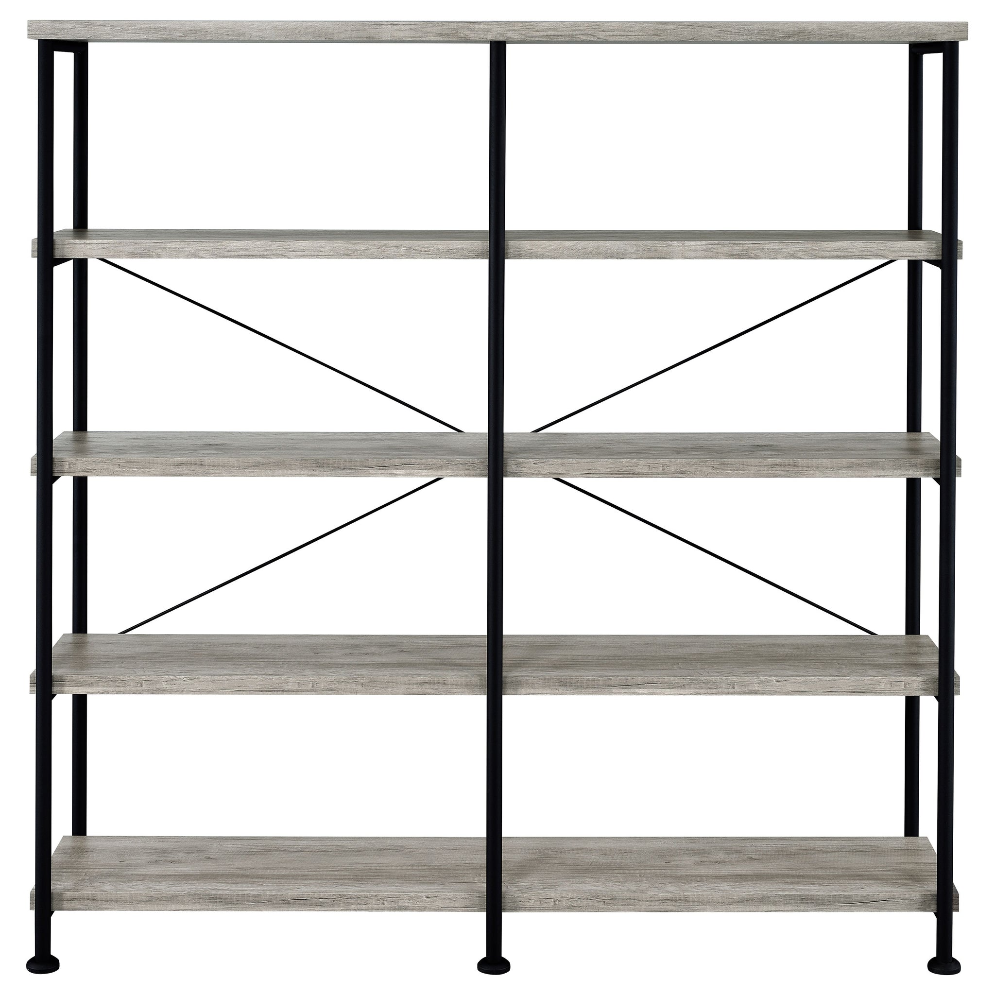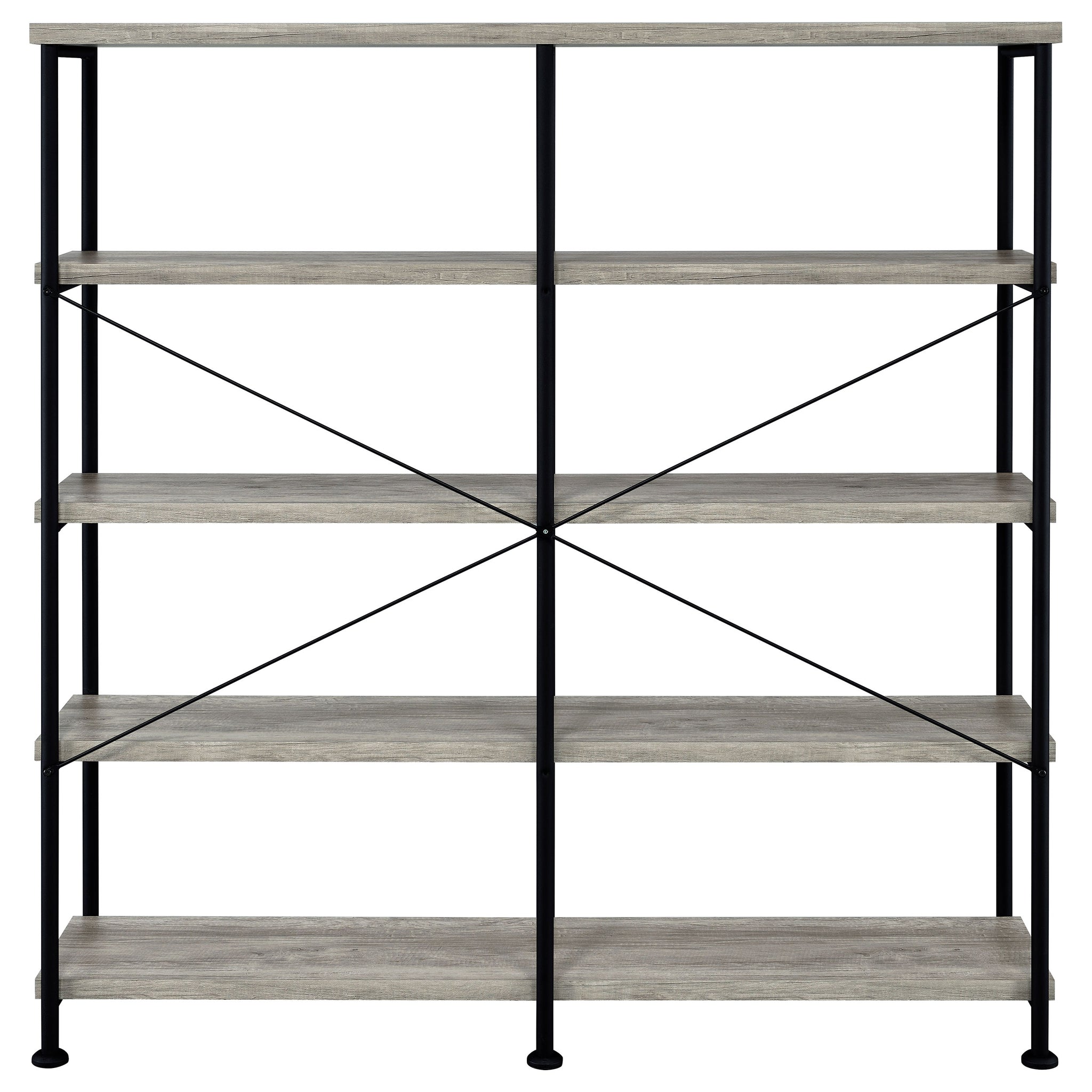 Embrace a traditional look with contemporary upgrades. Choose this bookcase to organize accents and books in a transitional space. Minimalist styling reflects a classic dynamic reflecting a hint of industrial aesthetics. Find plenty of room on four side shelves to display books and decor. Select from finishes that suit your space. Key Features: • Double bookcase with four extra-wide tiers for ample display and storage space • Rustic nutmeg finish offers a warm wood tone with industrial character • Black powder-coated steel frame enhances contrast and structural stability • Crossbar detailing on the back reinforces support without adding bulk • Open shelf design keeps contents visible and accessible from all sides • Made from engineered wood, melamine paper, and heavy gauge metal