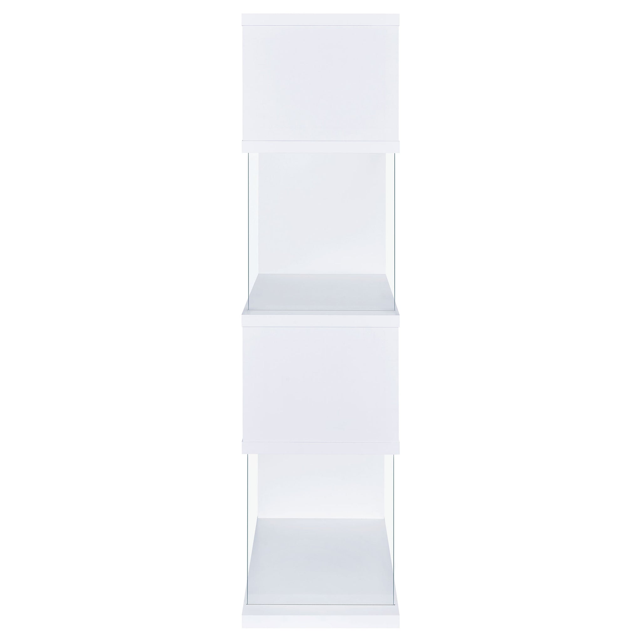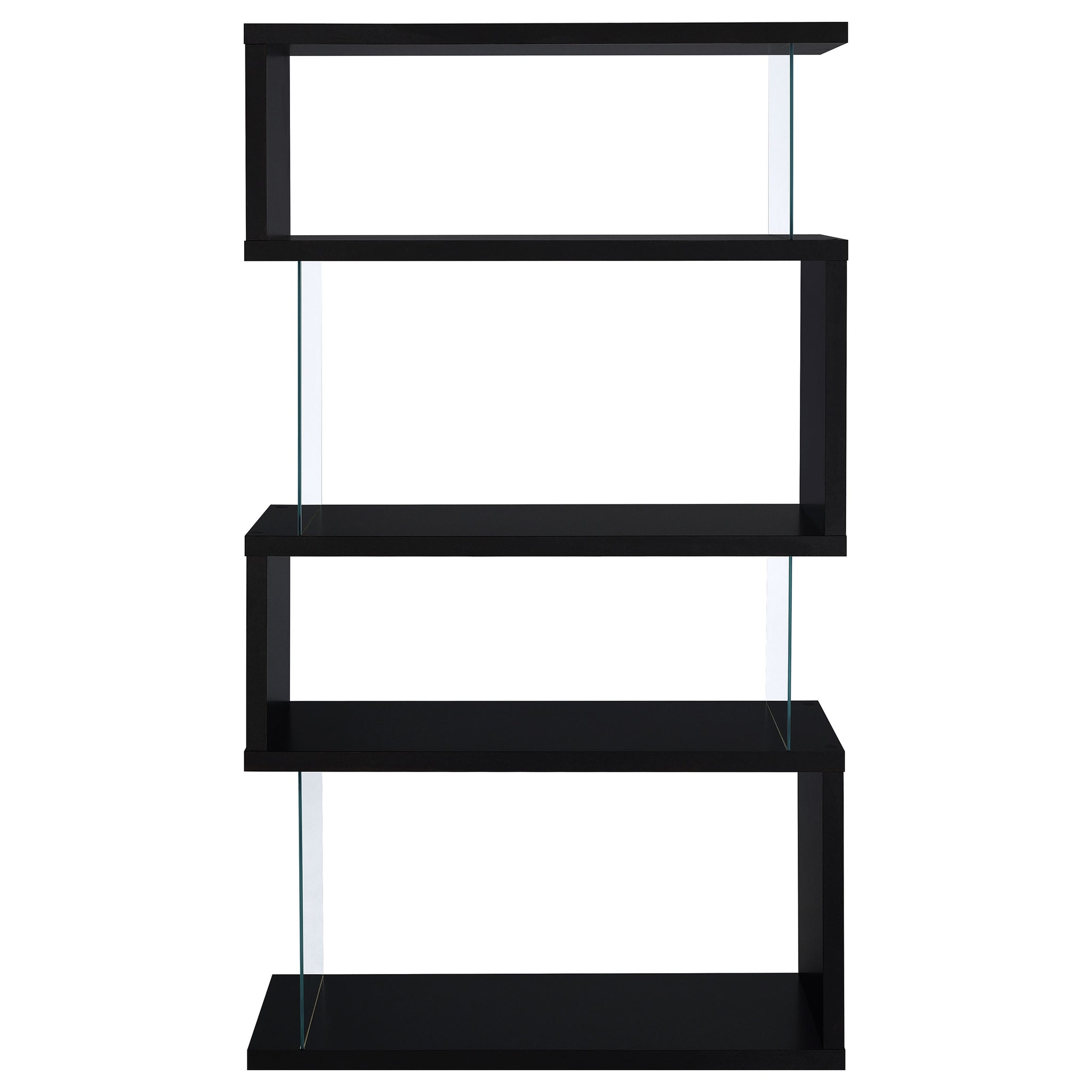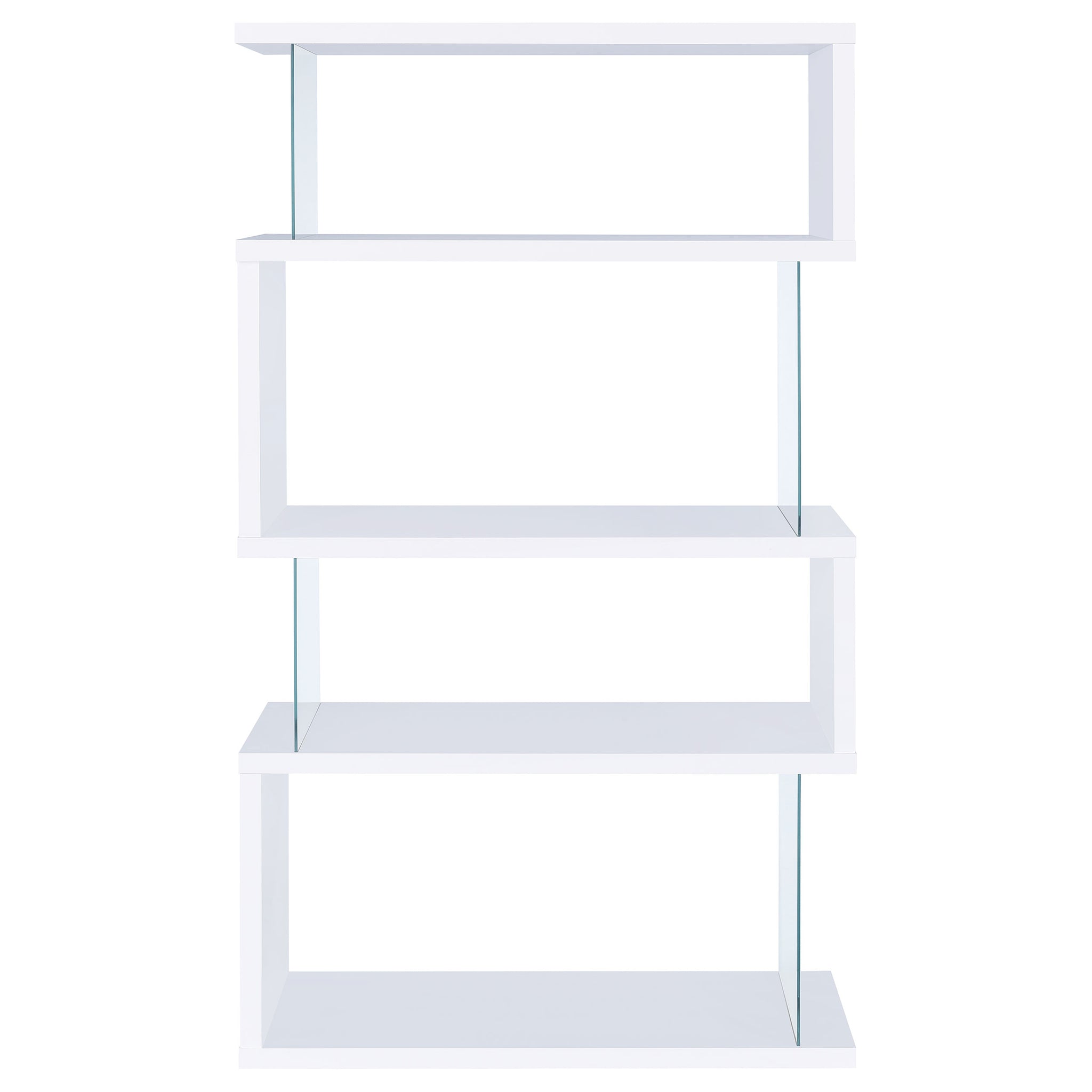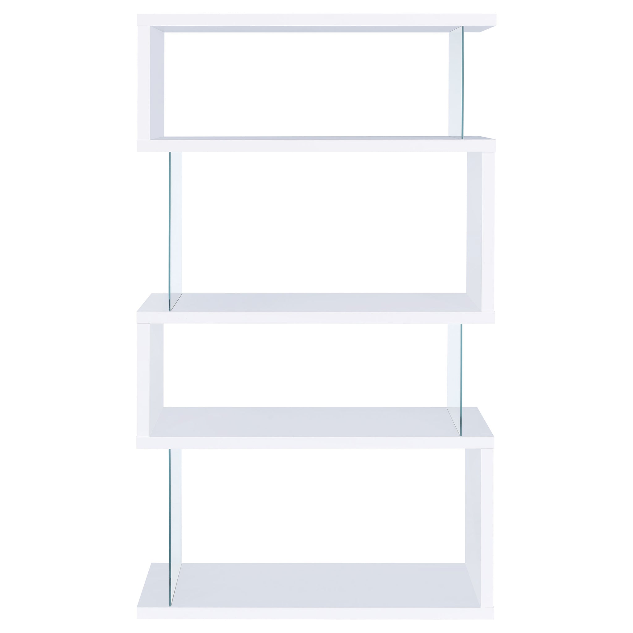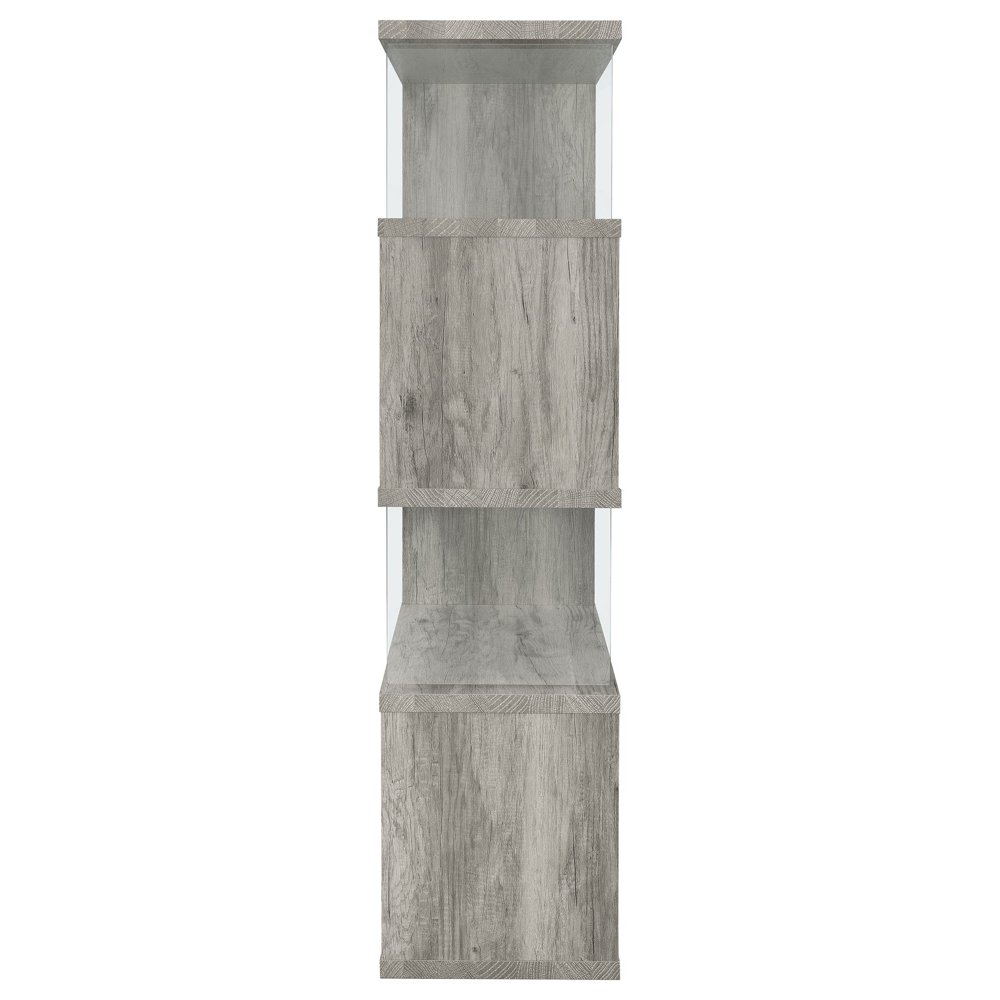 The asymmetrical zig-zag design of this contemporary bookcase creates a focal point in any room. Five open shelves in a light grey driftwood finish stack elegantly, supported by clear glass side panels that lend a modern flair to this furniture piece. Perfect for home offices, living rooms and much more, showcase anything from a book collection, decor, and other favorite items for all to see. With a flush base, this open bookcase unit rests sturdily and securely on the floor. Clean lines and a wonderful jagged design offer up style, functionality, and a stunning display. Key Features: • Zigzag bookcase design with alternating grey driftwood shelves • Clear glass side panels lend support and create a floating effect • Four open shelves offer space for books, décor, or personal items • Flush base rests flat on floors for added security and balance • Constructed from engineered wood, laminate veneer, and tempered glass • Modern sculptural format complements minimalist and contemporary rooms