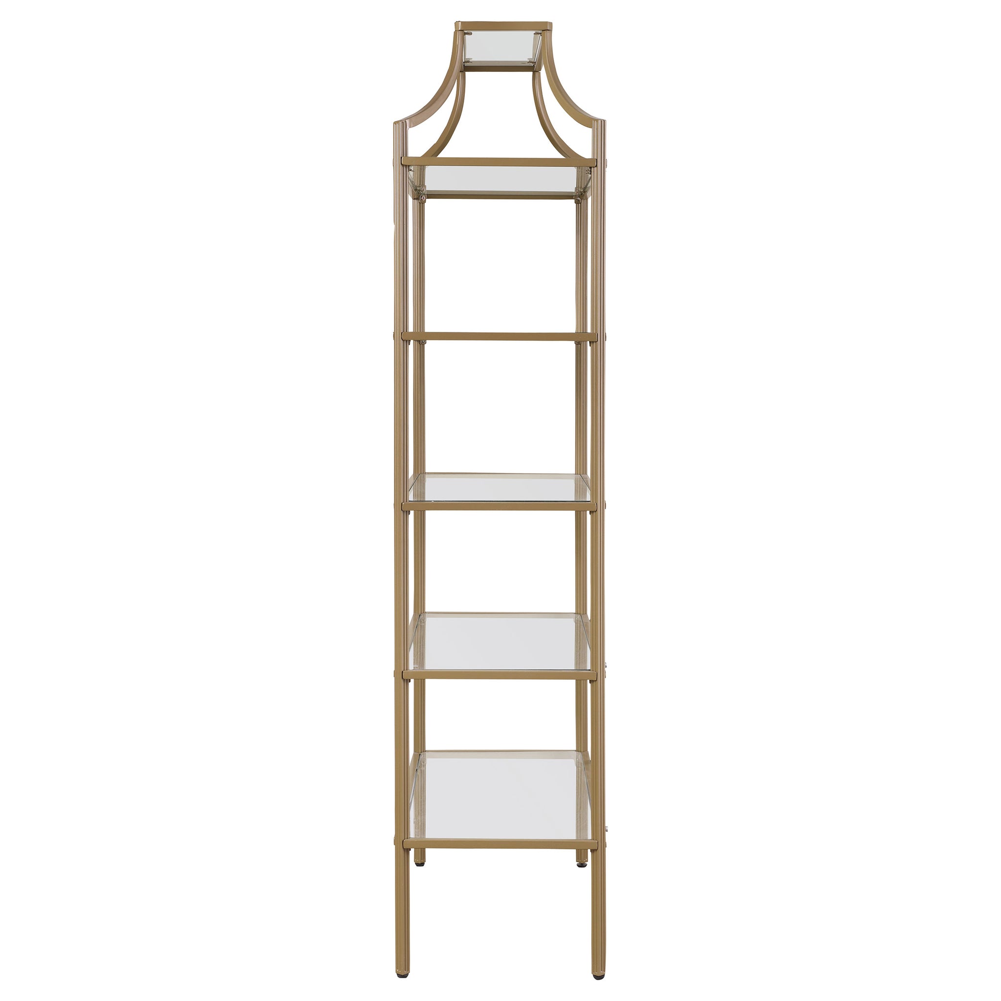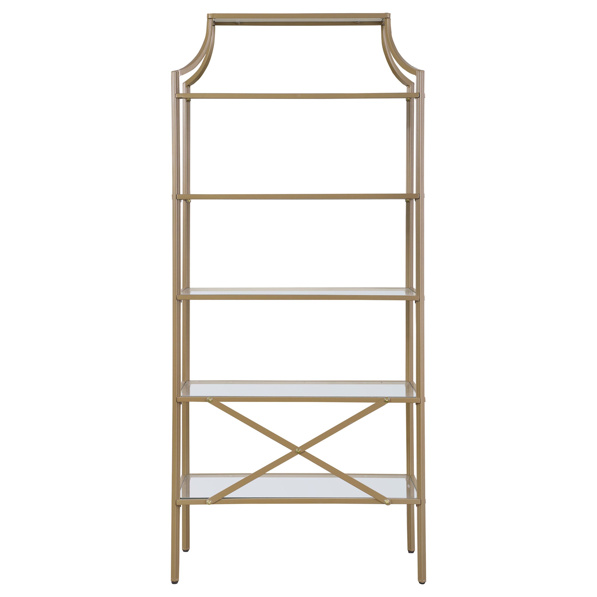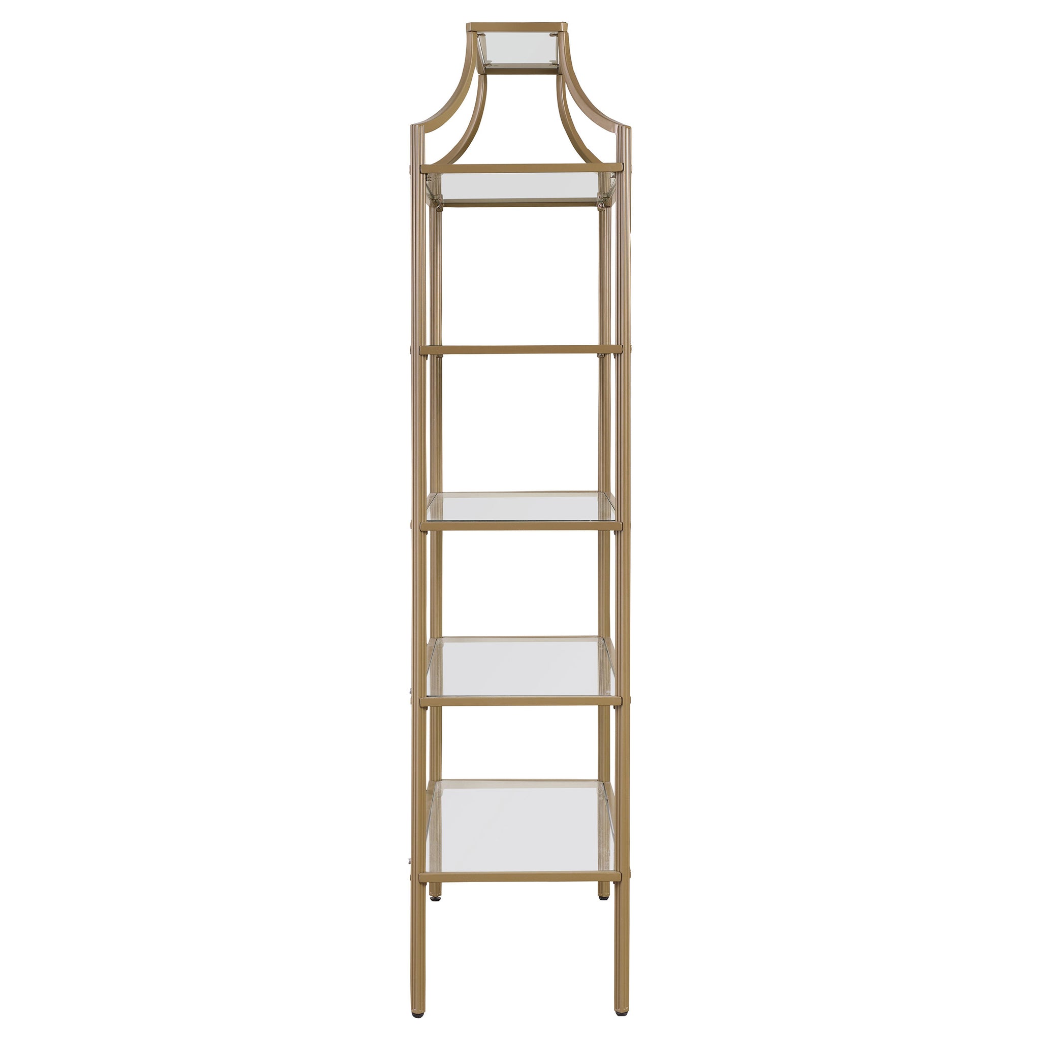A call for strength and style gets answered by this bookcase. Contemporary style allows for easy placement within your space. The stylish metal frame in gold creates conversation. Enjoy durability as all glass elements are tempered. Updated unit boasts five (5) open shelves for use as storage or display. Key Features: • Five-tier bookshelf with glass shelves and matte gold metal frame • Open art deco silhouette features soft curves and geometric lines • Tempered glass shelving provides stable display for books and décor • Powder coated metal frame enhances durability and visual appeal • Slim profile is ideal for narrow living rooms, offices, or entryways • Tip-over restraint included for safe, anchored installation