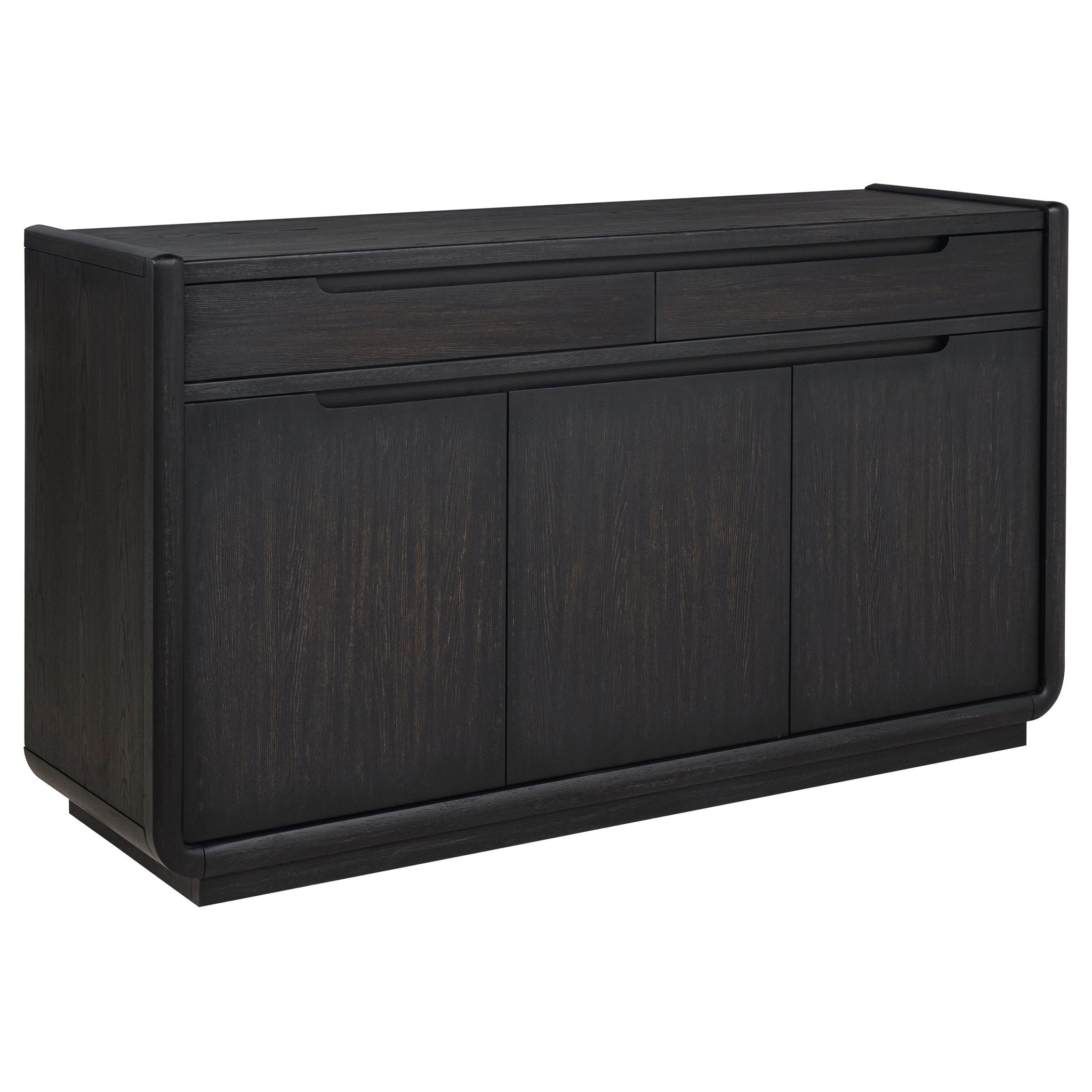 With a presence both grounded and graceful, this sideboard offers quiet beauty and purposeful design. Draped in a burnished black finish, its soft curves and minimalist lines open to thoughtful storage, two felt-lined drawers for treasured linens and flatware, and three softly closing doors revealing fixed shelves behind. Each detail, from the whisper-quiet glides to the dust panel below, is a study in balance, offering elegance that lingers long after the meal is done. Key Features: • Dining sideboard in burnished black with sculpted edges and clean, recessed pulls • Two felt-lined drawers with soft-closing ball bearing glides for refined storage • Three soft-close doors conceal fixed shelves ideal for serving pieces and dishware • Dust panel at the base ensures fully enclosed, protected storage space • Crafted from ash veneer, rubberwood, engineered wood, and plywood • Bold presence with understated lines designed for modern dining settings