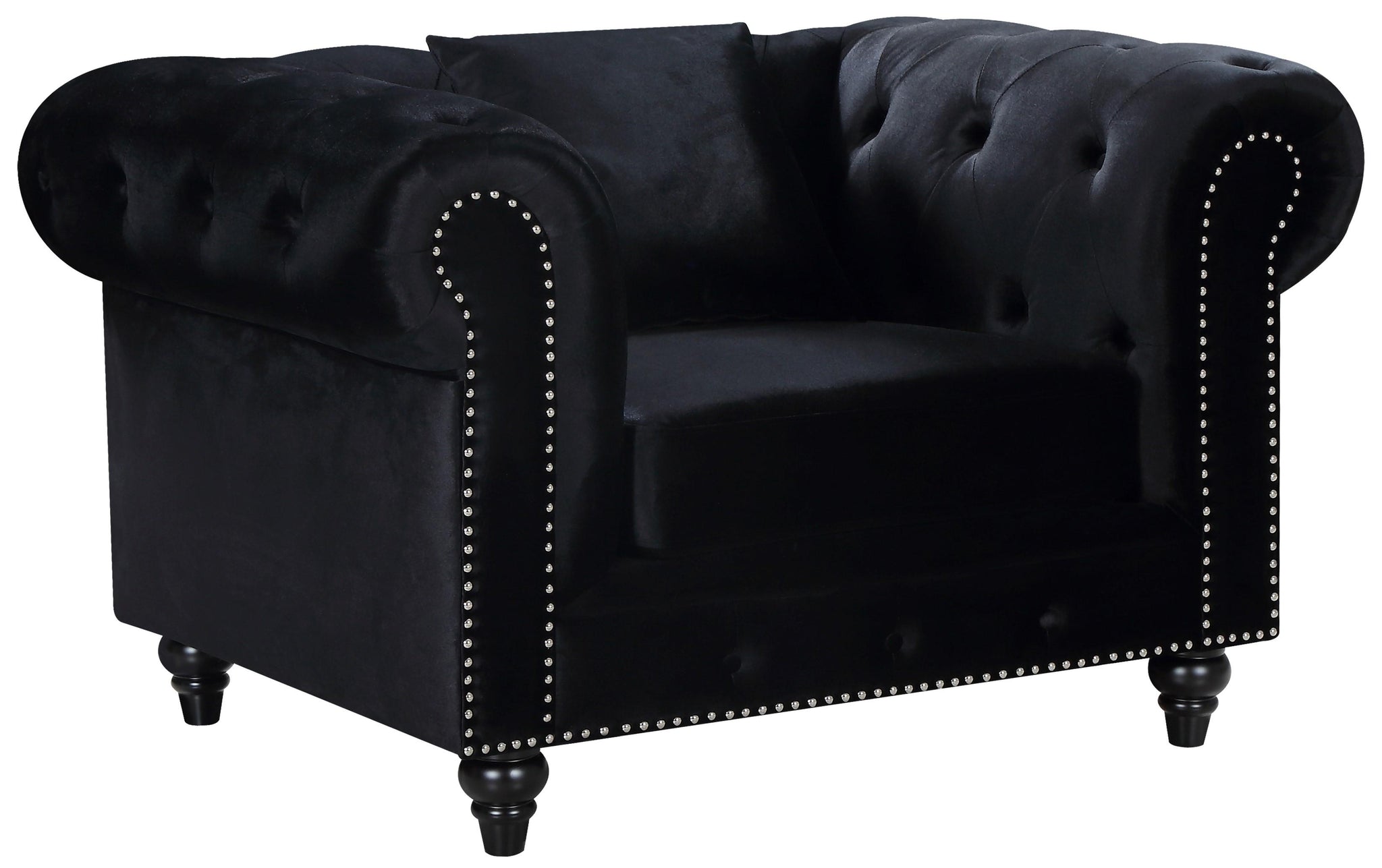 Elegant and eye-catching, the stunning Chesterfield Living Room from Meridian Furniture is the perfect addition to any space. Rich Velvet covers the plush, comfortable seat, padded with high-density foam and modern tufted design. Strength and beauty is guaranteed with a solid wood frame and legs. Features a nail head design on the arms and includes matching throw pillows.