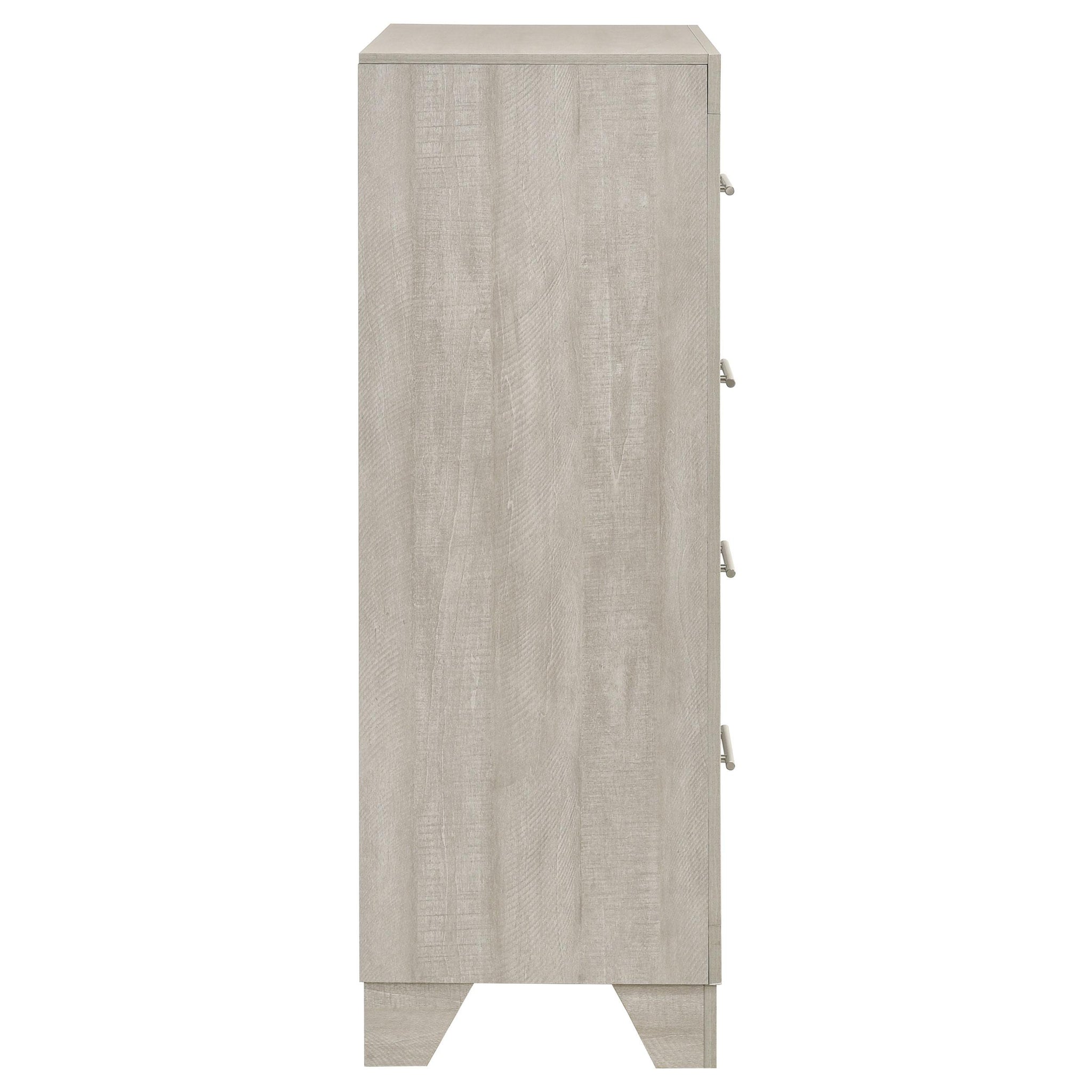 This four-drawer chest offers a stylish combination of rustic charm and modern design, making it a perfect storage solution for contemporary bedrooms. Finished in a rustic cream with rough-sawn, white-washed engineered paper veneer, it has a warm, textured appeal that’s both inviting and chic. The extra-wide polished nickel handles add a sleek, modern touch, creating a subtle contrast. Built with engineered wood, the chest features English dovetail joinery and Center metal glides for durability and smooth functionality, ensuring it meets both aesthetic and practical needs.