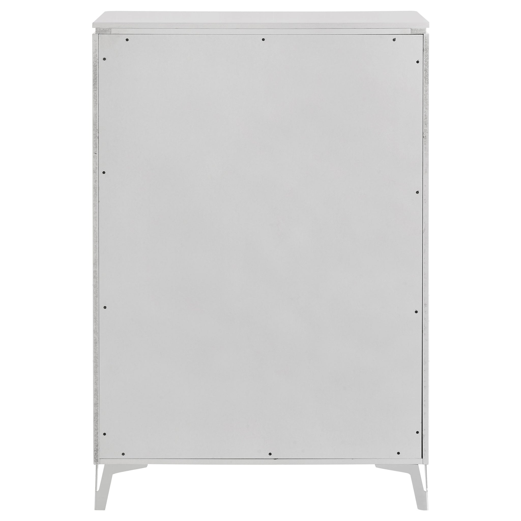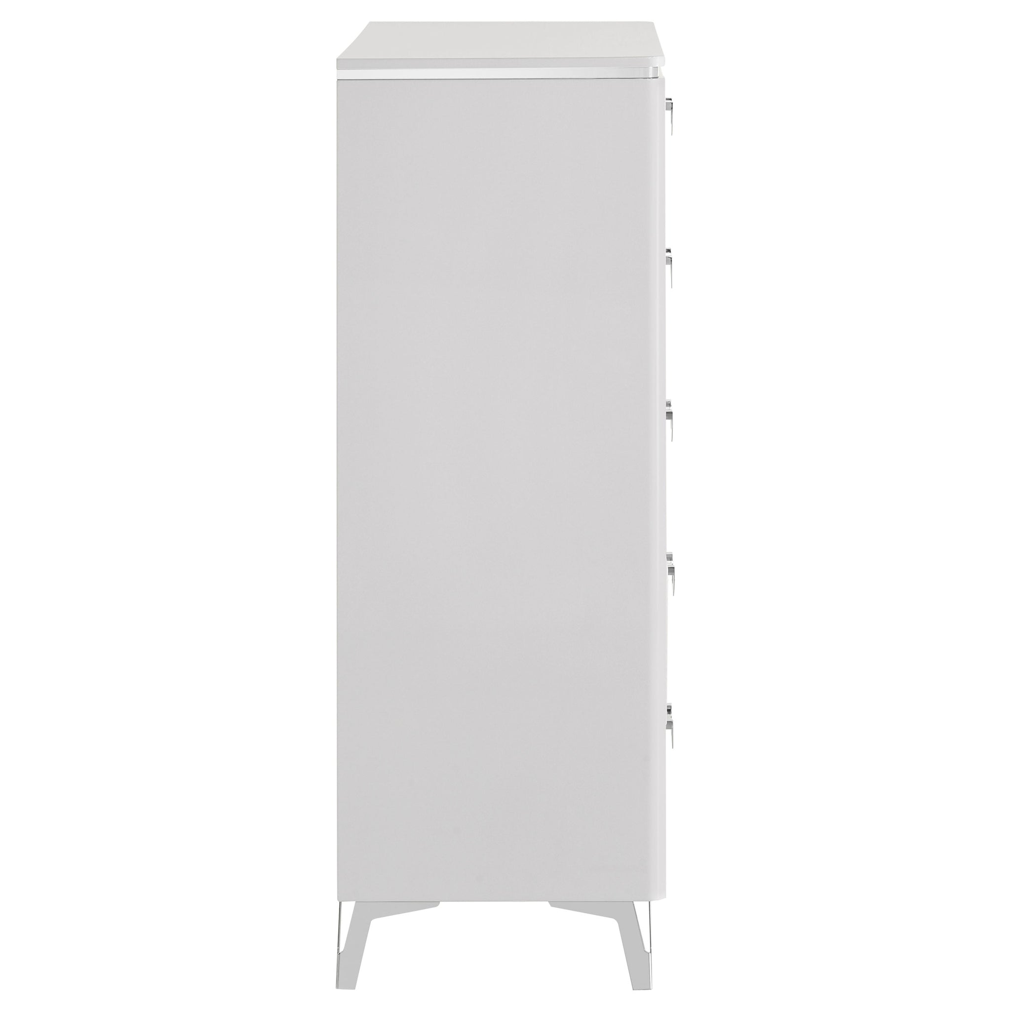 With a sleek high gloss finish and sculptural texture, this five-drawer chest makes a striking addition to the modern bedroom. Its geometric drawer fronts feature ribbed V-patterns that shift across each tier, accented by polished chrome U-shaped pulls. The top drawer is lined in black felt for delicate storage, while all drawers operate smoothly on 45mm metal extension glides. Elevated on tapered chrome-finished legs, this chest offers elevated storage with sharp visual impact. Key Features: • Five-drawer chest in white high gloss finish with sculptural ribbed geometric drawer fronts • Top drawer is fully lined in black felt to protect jewelry and delicate items • 45mm metal extension drawer glides ensure smooth and consistent drawer performance • Polished chrome U-shaped pulls add sleek contrast to textured sculptural surfaces • Tall vertical form provides generous storage in a modern, compact footprint • Crafted from engineered wood for style, structure, and longevity
