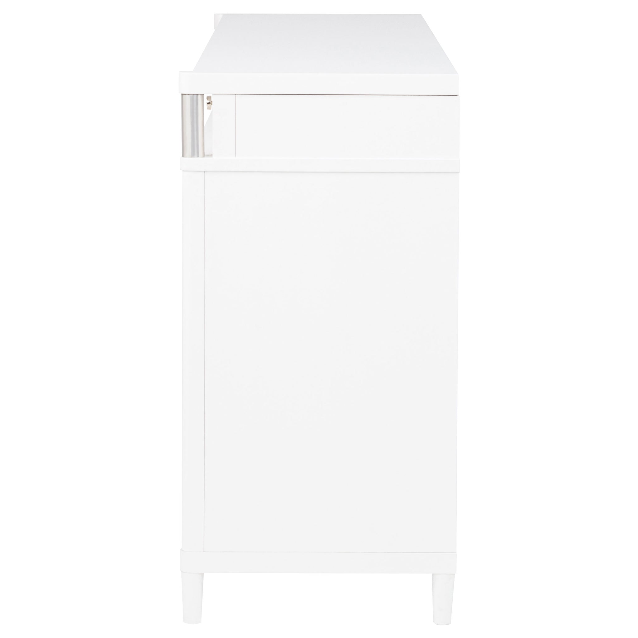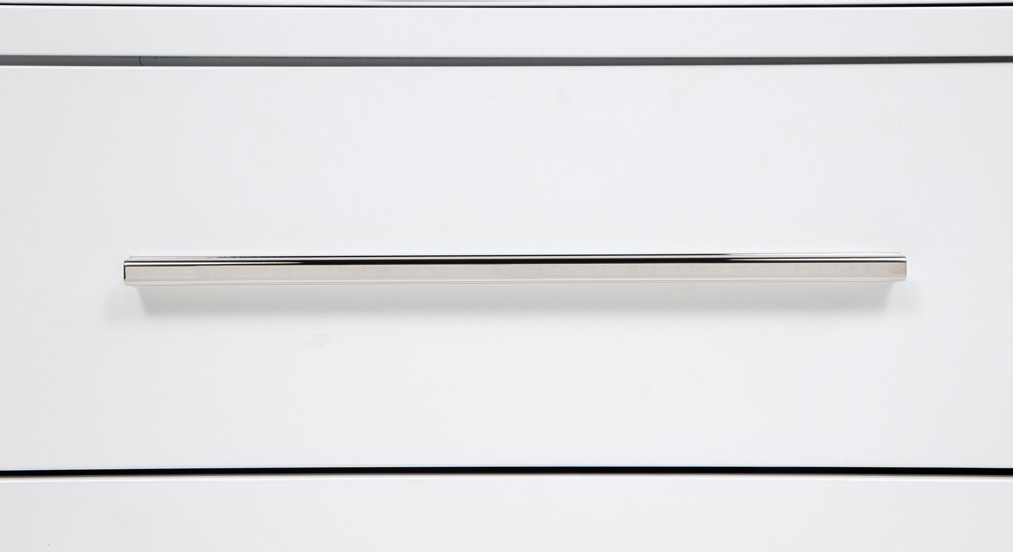 This eight-drawer dresser exudes modern sophistication through a sleek silhouette and softened edges. Elongated brushed nickel pulls and vertical tube accents create visual interest while enhancing the dresser’s clean structure. Built from solid rubberwood, engineered wood, and finished with a smooth laminate veneer, it offers ample storage and felt-lined top drawers. Designed for refined function in any contemporary bedroom. Key Features: • Eight-drawer dresser with softened corners and a clean-lined, modern silhouette • White finish contrasts with brushed nickel pulls and vertical metal tube accents • Felt-lined top drawers with tinted interiors provide secure, organized storage • Drawers feature dovetail joints and glide smoothly on heavy-duty metal glides • Made from solid rubberwood, engineered wood, and smooth laminate veneer • Fully assembled dresser includes integrated tip-over restraint for added safety