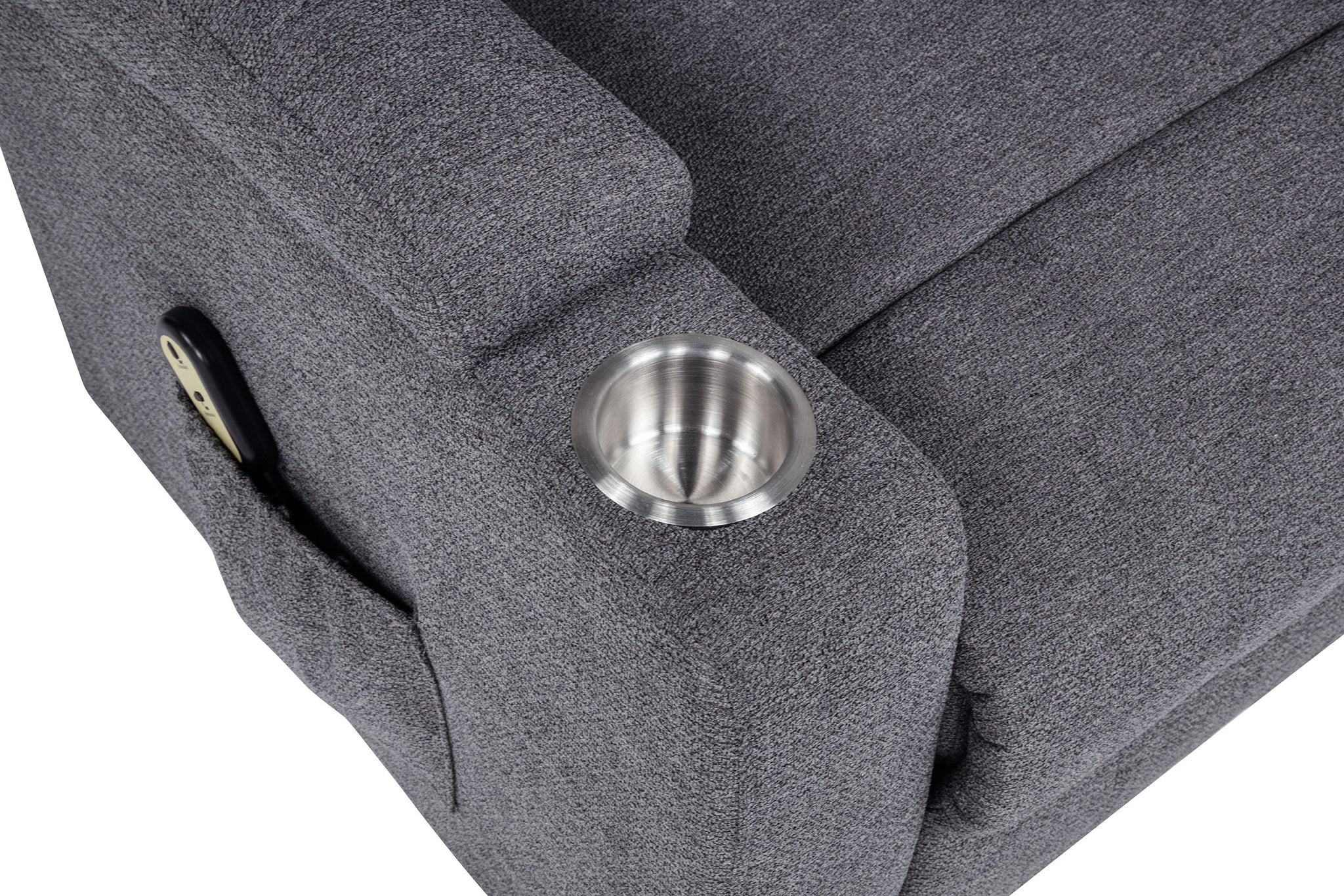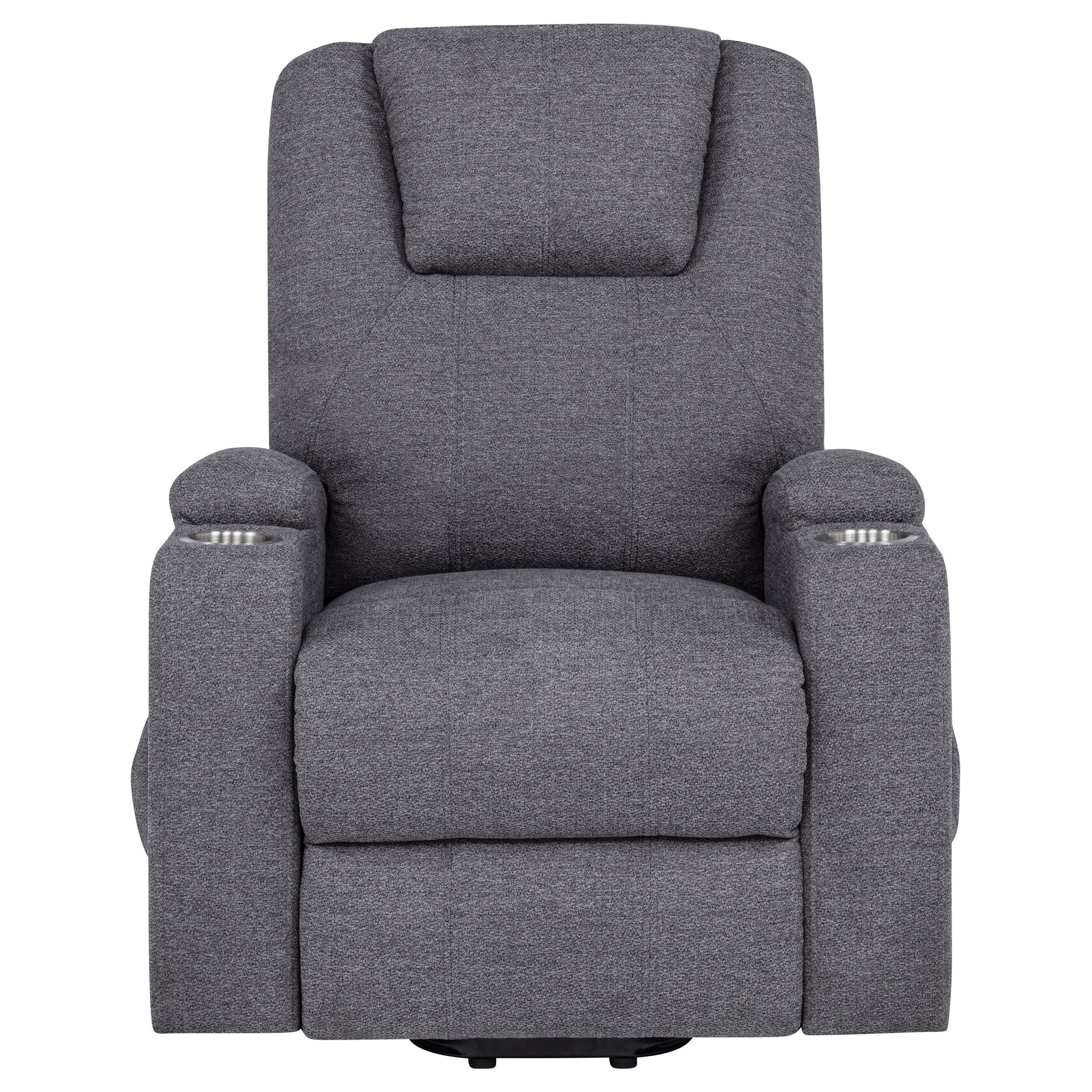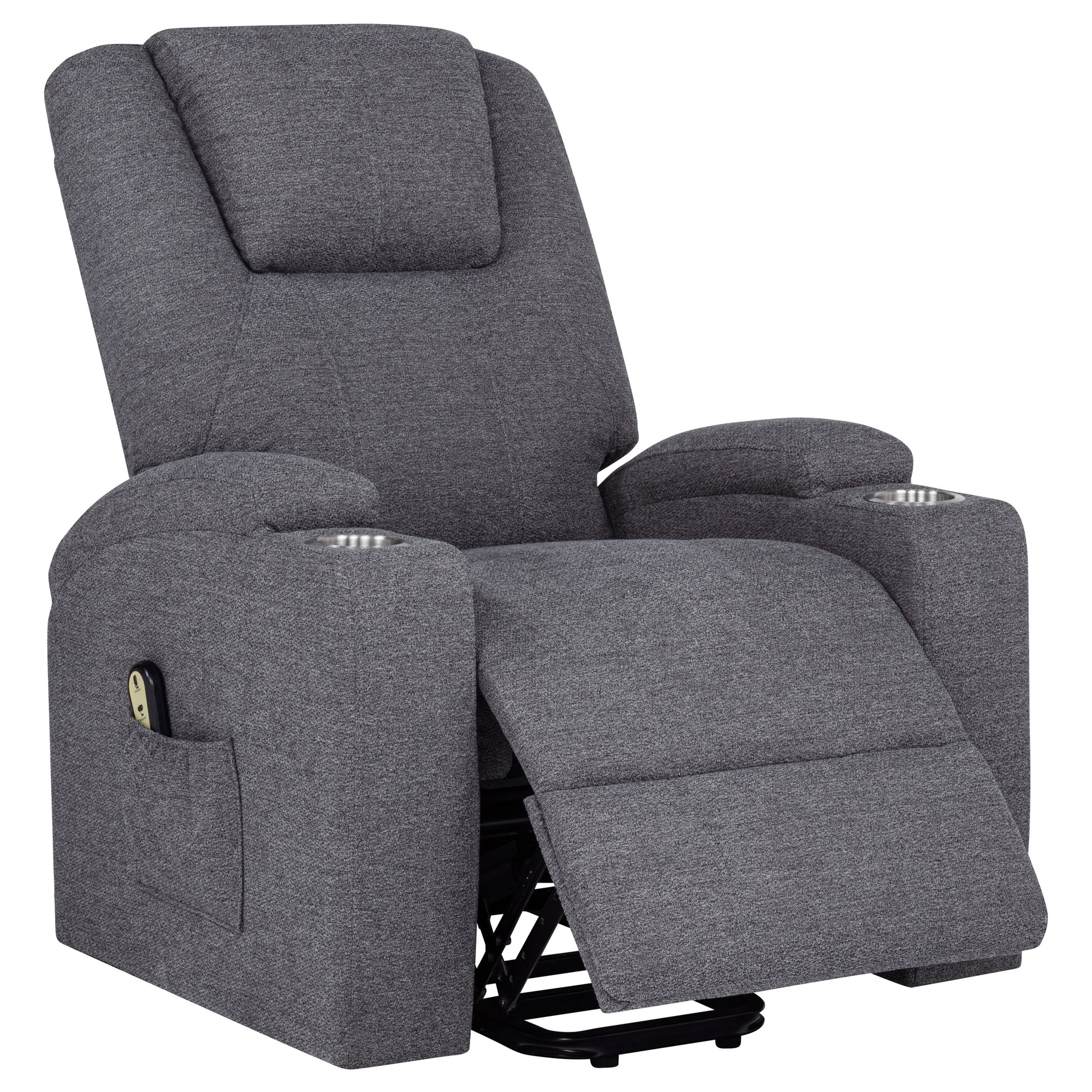 Gracefully merging comfort, function, and care, this power lift massage chair offers a luxurious retreat at the touch of a button. Wrapped in soft chenille, its plush silhouette supports you with gentle recline, heated massage, and a smooth lift mechanism—perfect for easing into or out of relaxation. Dual stainless steel cup holders and side storage pockets provide thoughtful utility, making it a serene and supportive haven for everyday unwinding. Key Features: • Power lift massage chair in dark grey chenille offers wired remote-controlled recline and lift • Heat and vibration massage functions provide soothing comfort at the touch of a button • Stainless steel cup holders on both arms keep beverages secure and accessible • Side storage pockets on both sides hold remotes, reading material, or small essentials • Plush cushioning with supportive back and pillow-top arms enhances everyday comfort • Ideal for those seeking independence, recovery support, or elevated daily relaxation