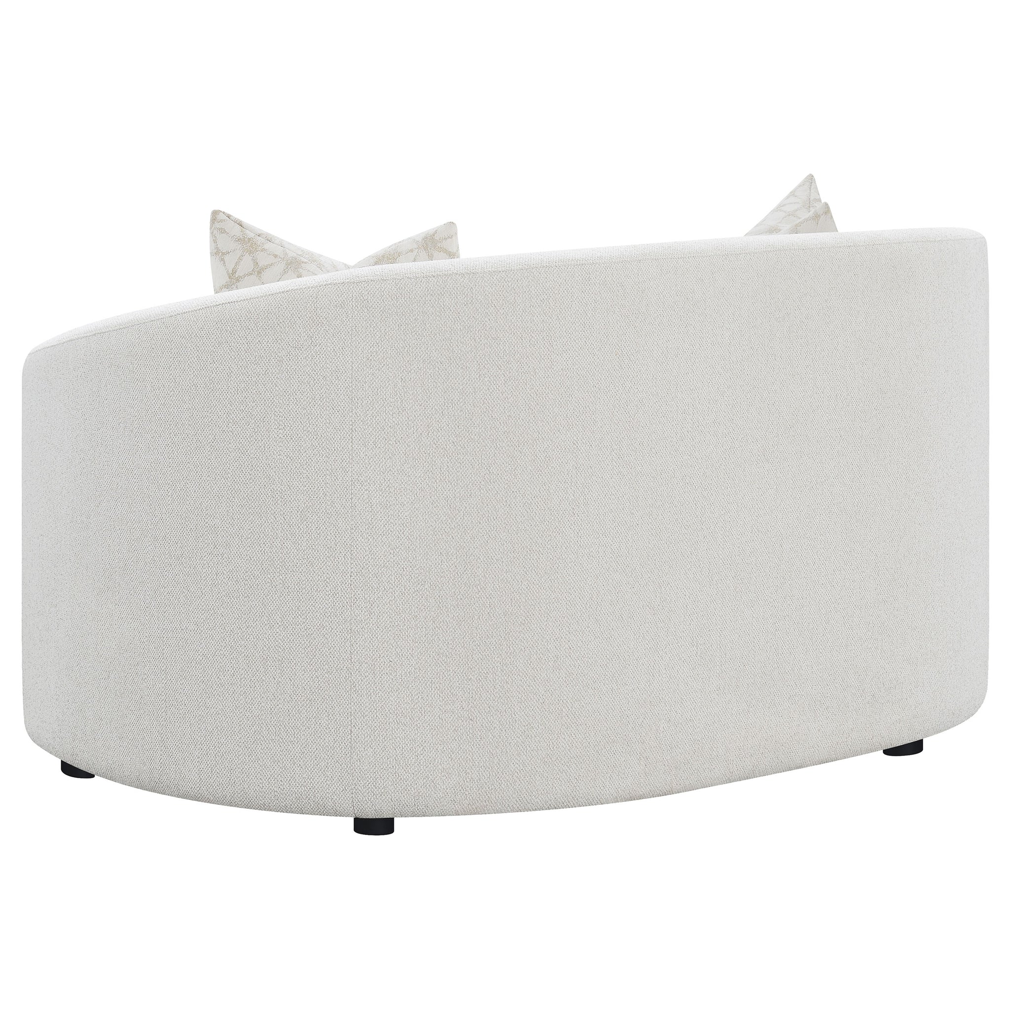 Gracefully contoured and inviting, this boucle loveseat brings soft sophistication to any space. The curved silhouette and sloped armrests offer a modern nod to mid-century design, while the latte boucle fabric provides tactile warmth and texture. Plush seat cushions ensure lasting comfort, complemented by accent pillows filled with premium faux down for a touch of luxury. Supported by discreet black legs, this loveseat balances elegance and coziness, creating a perfect retreat for contemporary living rooms._x005F_x000D_ Key Features: • Curved loveseat wrapped in soft latte boucle upholstery for texture • Sloped armrests and rounded edges highlight graceful contours • Two plush seat cushions deliver superior comfort and support • Tight back design maintains a smooth, tailored modern appearance • Accent pillows with faux down fill enhance softness and appeal • Perfect for compact living areas seeking warmth and sophistication