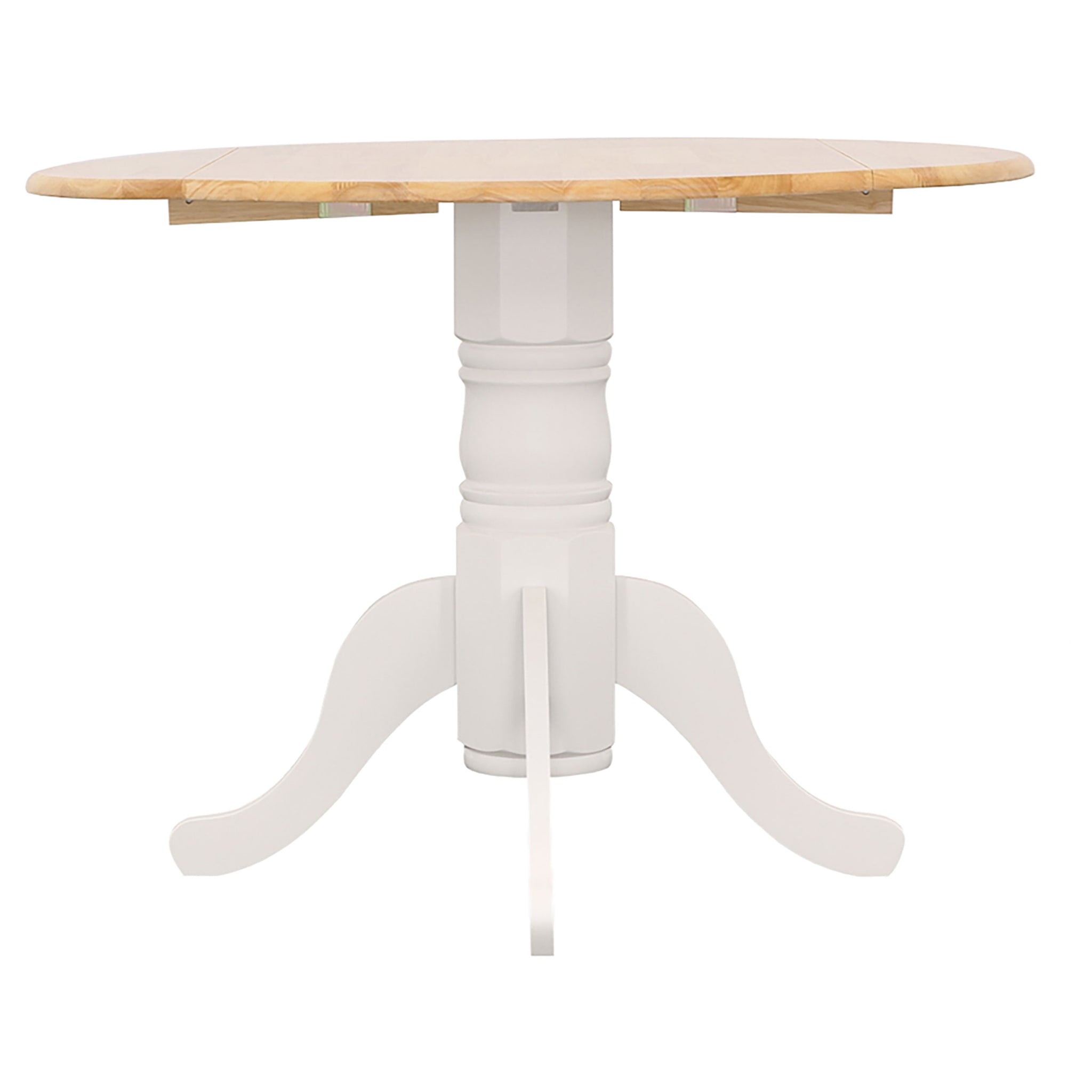 Bring cozy charm to your dining area with this round drop leaf dining table. Designed with a smooth tabletop and sturdy pedestal base, it combines traditional craftsmanship with functional versatility. The drop-leaf design allows you to expand or reduce the surface space as needed, perfect for compact dining areas or breakfast nooks. Elegant curved legs add a touch of sophistication, while the contrasting natural wood top and white base create a bright, welcoming two-tone look for everyday gatherings. Key Features: • Dining table features a classic round drop-leaf top for versatile seating • Crafted from solid rubberwood for dependable everyday durability • Smooth two-tone finish with a natural top and crisp white base • Elegant turned pedestal design adds timeless farmhouse appeal • Four curved legs provide balanced support and visual refinement • Perfect size for small dining spaces, kitchens, or breakfast nooks