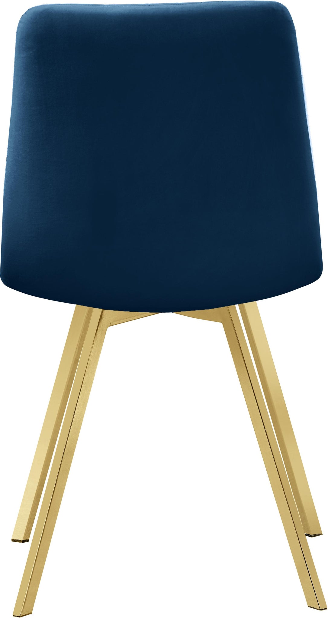 Pull up the Annie soft navy velvet dining chair and sit down for a little while. Decorated with attractive box tufting, this lightweight, contemporary chair has a backrest that gently curves into the seat, and both are cushioned for your comfort. The gold metal legs are square shaped, and they angle out gracefully to give this chair added stability. The Annie pairs nicely with several of the dining tables available.