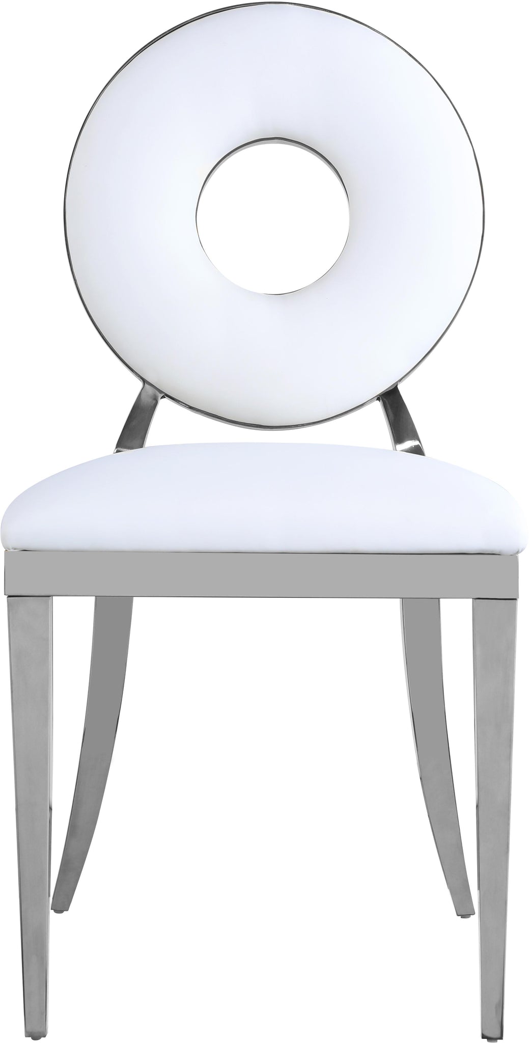 Yield to the decorator within when you bring home this Carousel faux leather dining chair. This chair features a metal frame and legs finished in gold stainless steel for a modern touch, but the real star of the show is the donut-shaped seat back that exudes undeniable contemporary charm. The seat and back are both plumply filled for comfort and upholstered in soft white faux leather for a chic look.