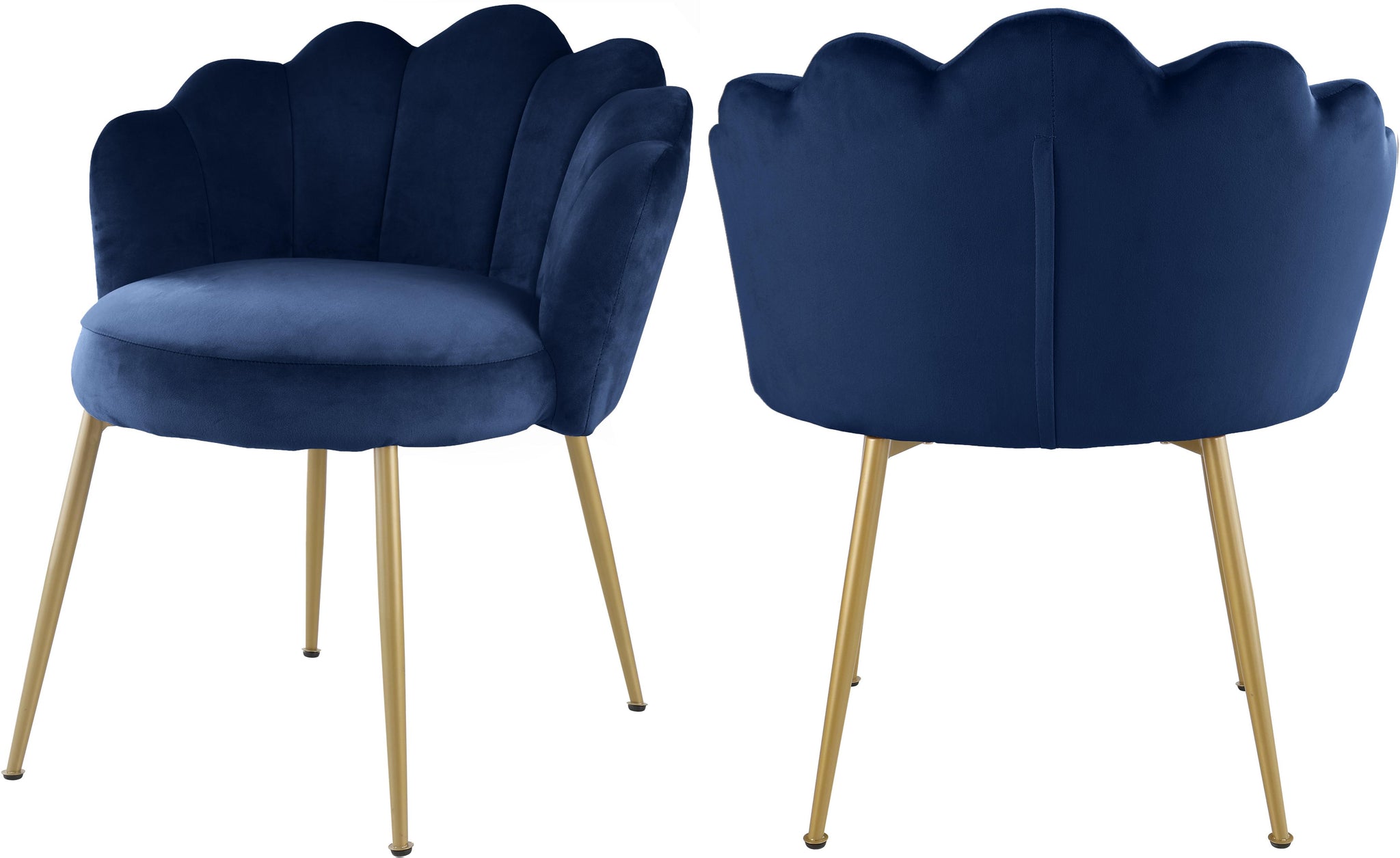 Sit back and get comfortable in this Claire Navy Velvet Dining Chair. Its elegant frame features soft plush navy velvet upholstery, providing you with a luxurious piece to rest upon while enjoying a meal or visiting with friends. Brushed gold steel legs offer sturdy frame support that complements the sleek dark appearance of this chair. Channel tufting adds extra stylishness to the chair's unique design, making it a great addition to any contemporary home decor.