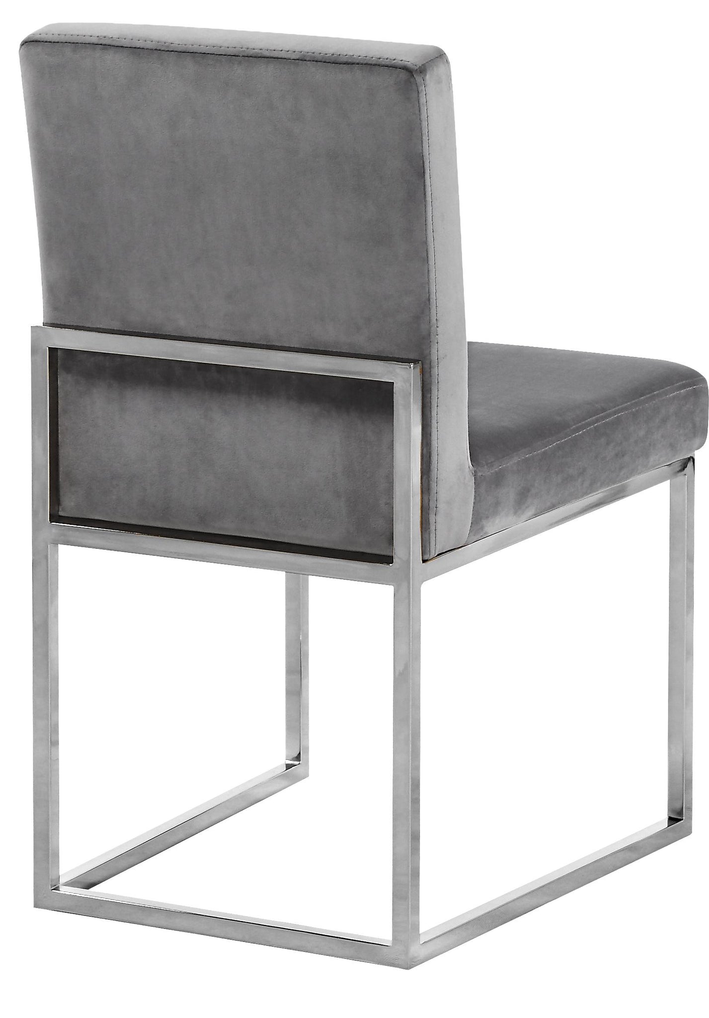Take dining to a posh new level with this Giselle Grey Velvet Dining Chair. A boxy design makes it a nice addition to contemporary spaces, and it's armless design makes it easy to get into and out of with ease. The seat and back are upholstered in rich grey velvet for a lavish vibe and a pop of sumptuous color to liven up your room, and both are padded well to make sure diners stay comfy while they enjoy their meal. The metal frame is finished in gold for added beauty and aesthetic appeal.