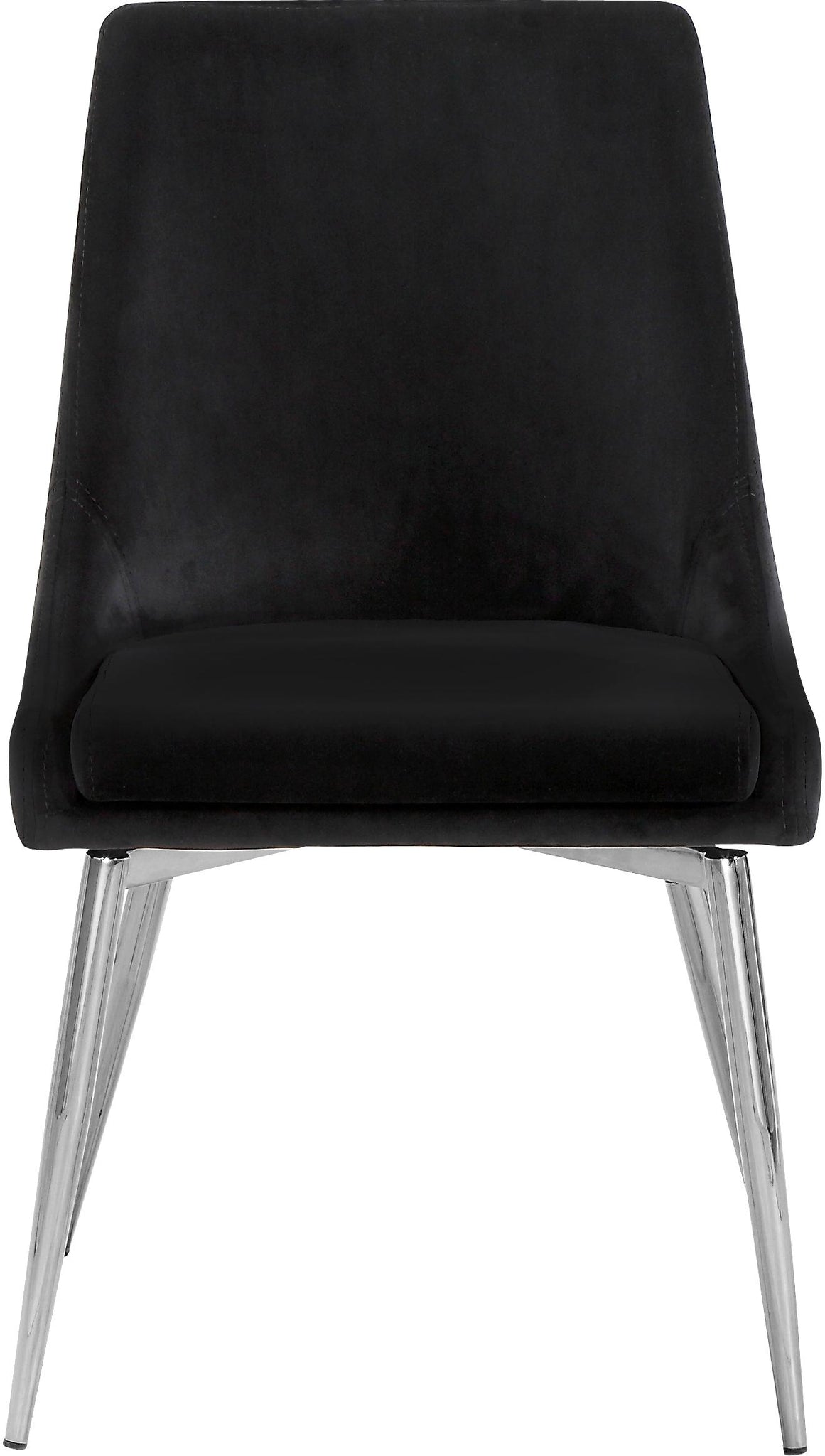 Extend contemporary panache to the dining room with this Karina Black Velvet Dining Chair. This dining chair features upholstery in sleek black velvet for a modern look and has an armless design for a retro-inspired vibe. The stark black color makes it easy to blend in with your existing decor colors or make a contrasting statement with ease. The slanted legs of this chair are gold finished for added modernity and to provide reliable and durable support while you dine.