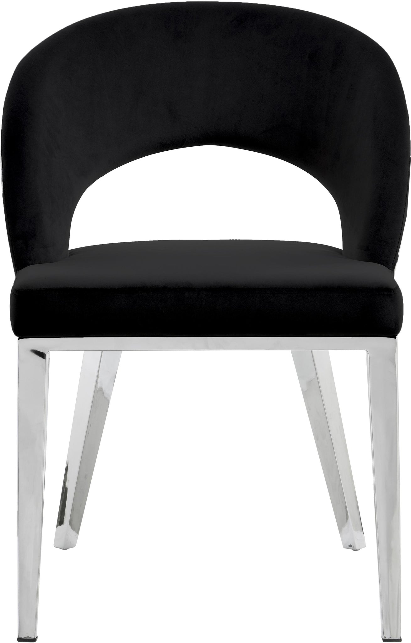 Seat dinner guests in elegant style with the Roberto black velvet dining chair from Meridian Furniture. This fabulous chair features a rounded back with strategically placed opening for visual beauty and to allow air flow while you dine. The rich black upholstery is chic and modern, and it has a soft feel against the skin. This chair rests on iron legs for superb support, and each leg is finished in chrome for a modish slant that meshes well with your up-to-the-minute dining room decor.