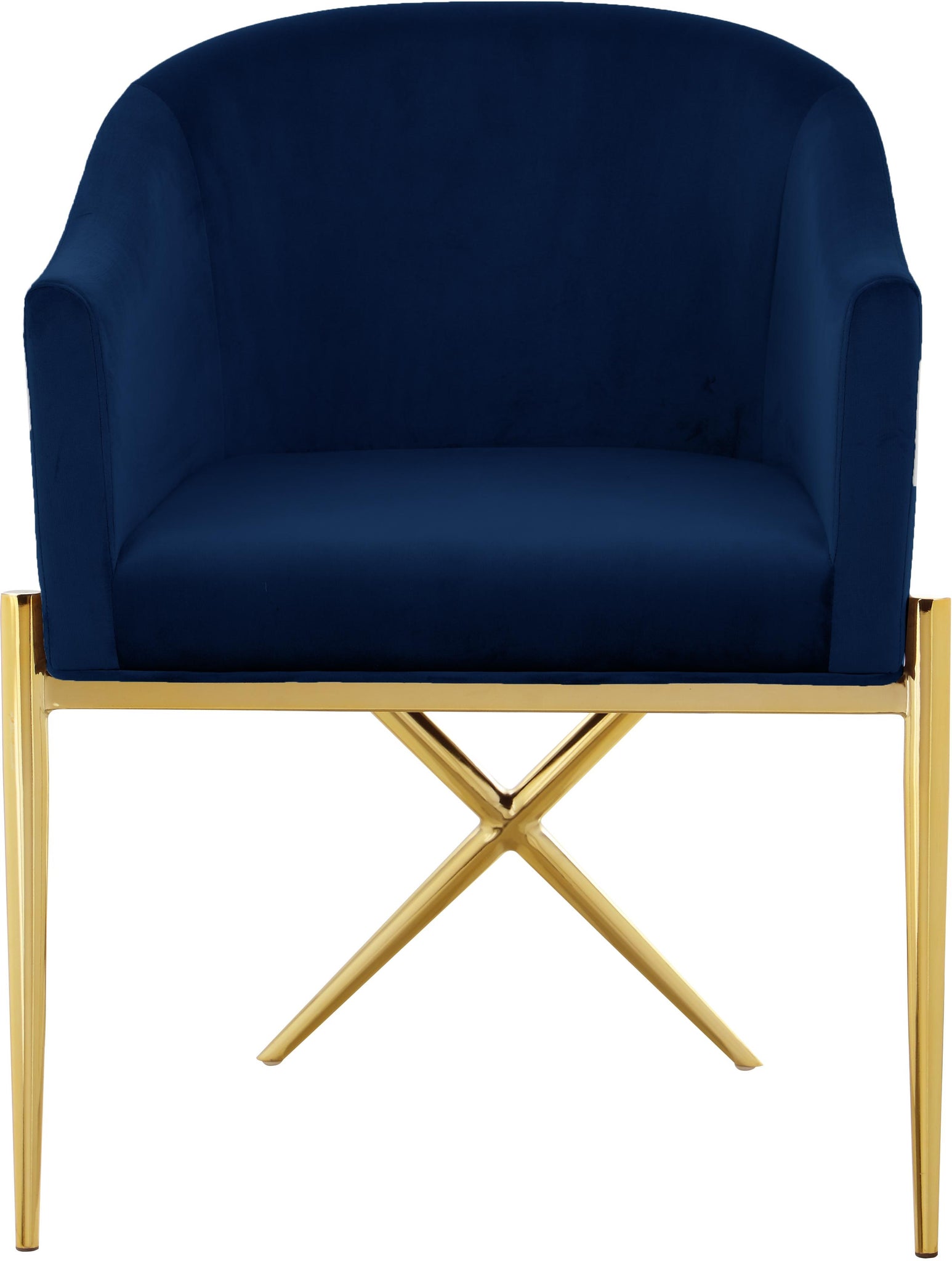 Spread elegance and modernity to your dining room with this Xavier navy velvet dining chair from Meridian Furniture. This beautiful chair features a simple barrel seat with a plush cushion and back, ensuring that every meal is a comfortable one. The chrome steel legs provide durable support while you sit, and an "X" leg in the back lends the chair an uber-modern vibe. Chrome finishing on the base is sleek and chic, giving this chair a contemporary edge that's well at home in any modern dining room. Sleek navy velvet upholstery is durable and tough yet soft against your body, elevating meal times to a luxurious experience.