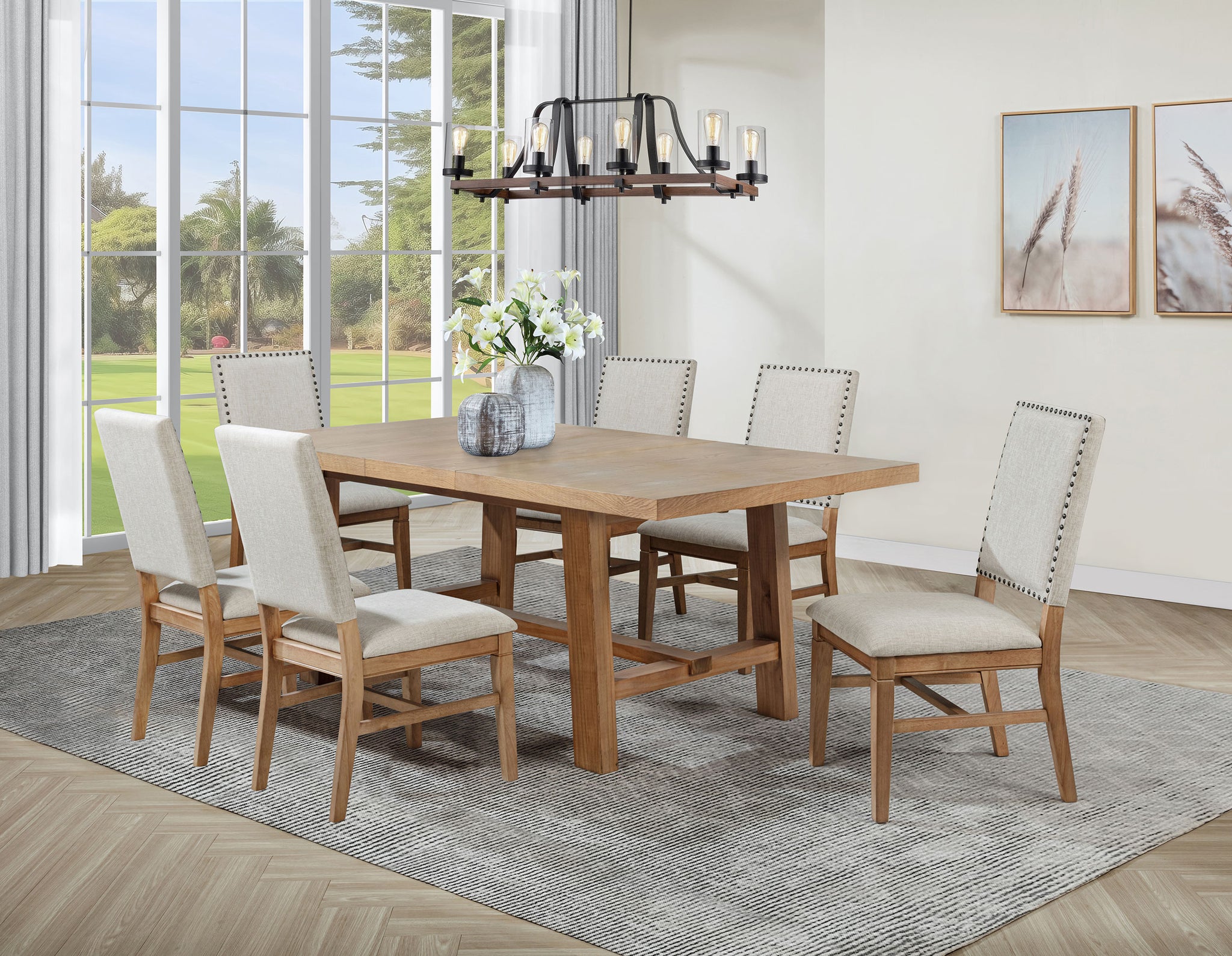 This sophisticated dining set combines timeless style with durability for an inviting dining experience. The extension dining table features a removable 16-inch leaf, expanding from 60 to 76 inches to accommodate both casual meals and formal gatherings. Solid mahogany, engineered wood, and ash veneer construction ensure lasting strength. Upholstered side chairs with beige fabric and black nailhead trim provide comfort and elegance. Designed for versatility, this set enhances any dining space with warmth and refinement.