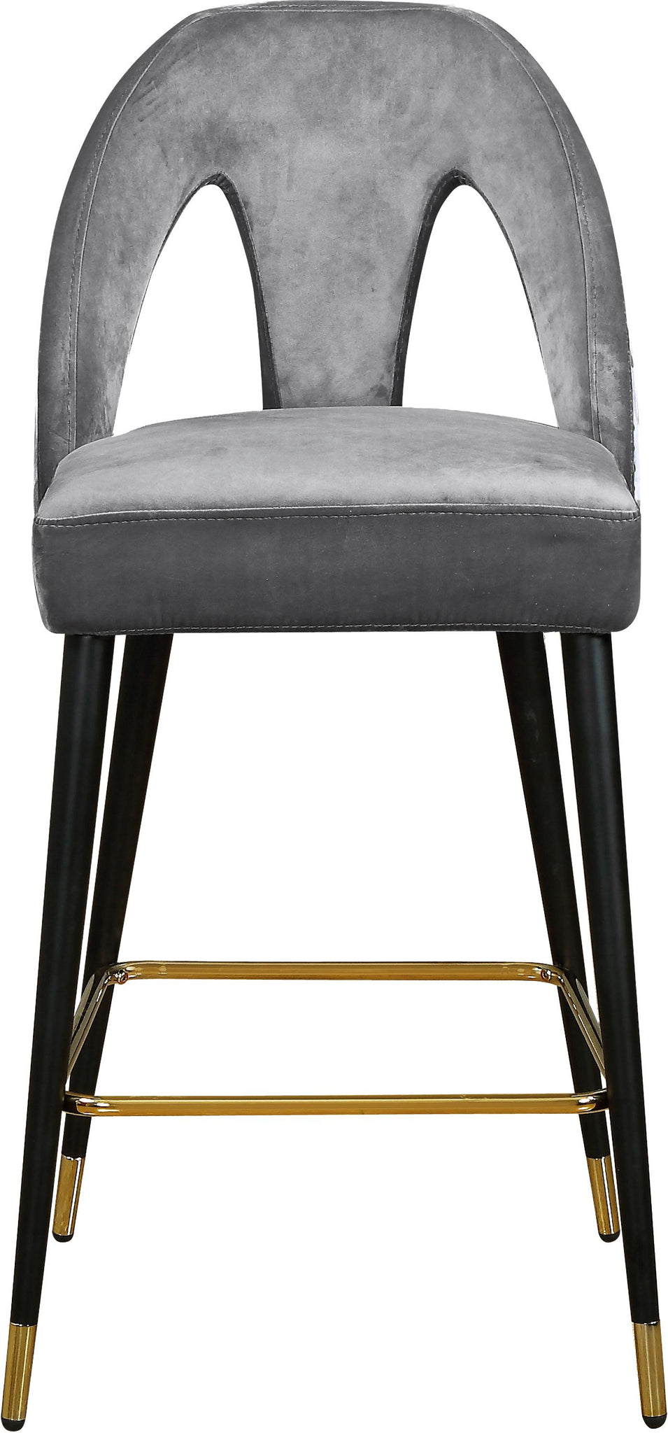 Modern and traditional elements collide in the design of this Akoya Grey Velvet Stool. Velvet upholstery covers the back and seat, giving it a decidedly glamorous look while two strategic cutouts provide just a hint of bold, modish fun. The gold nailhead trim on the back adds an edgy vibe, and metal legs in a black finish with goldtone tips rounds out the stool, providing sturdy support and a contemporary look.