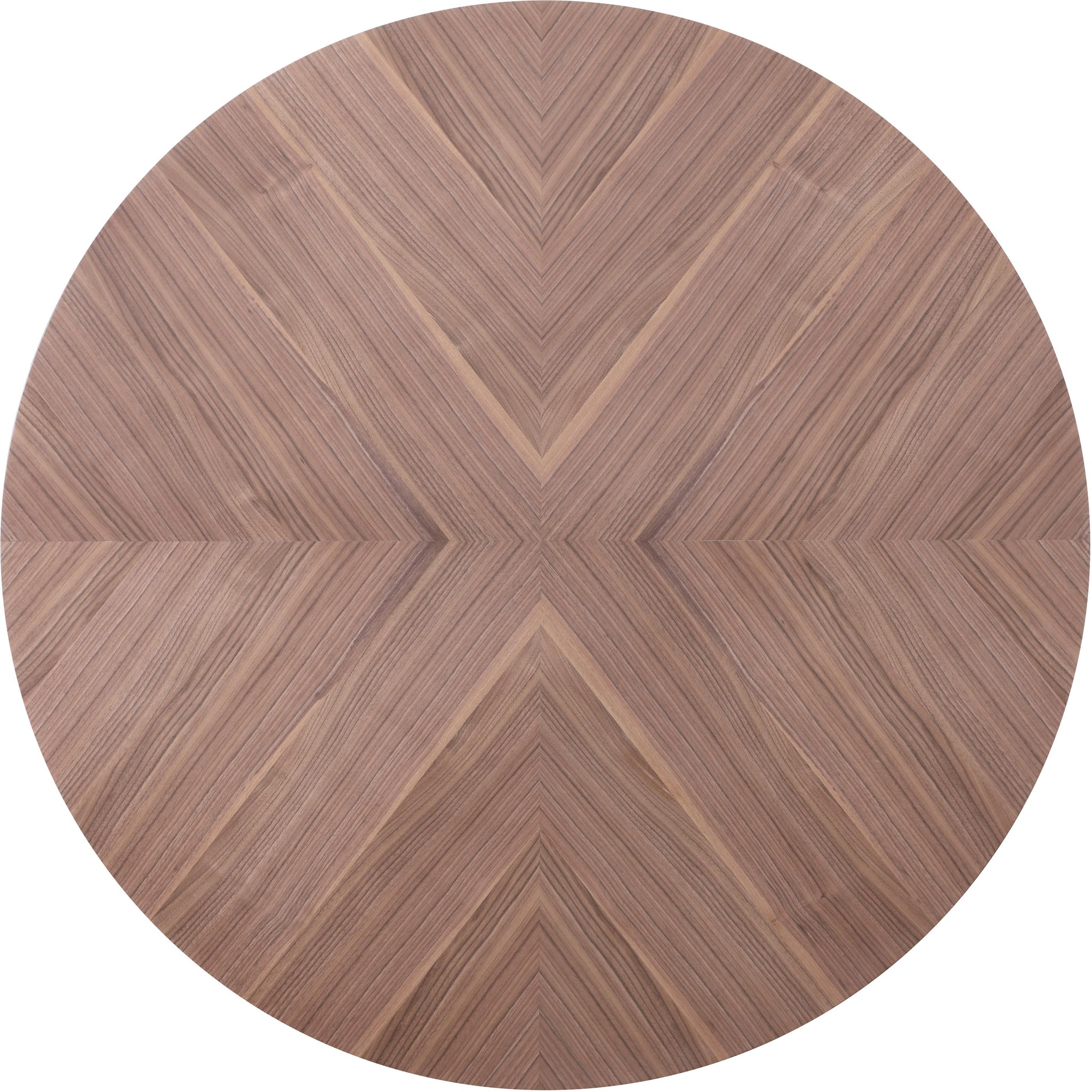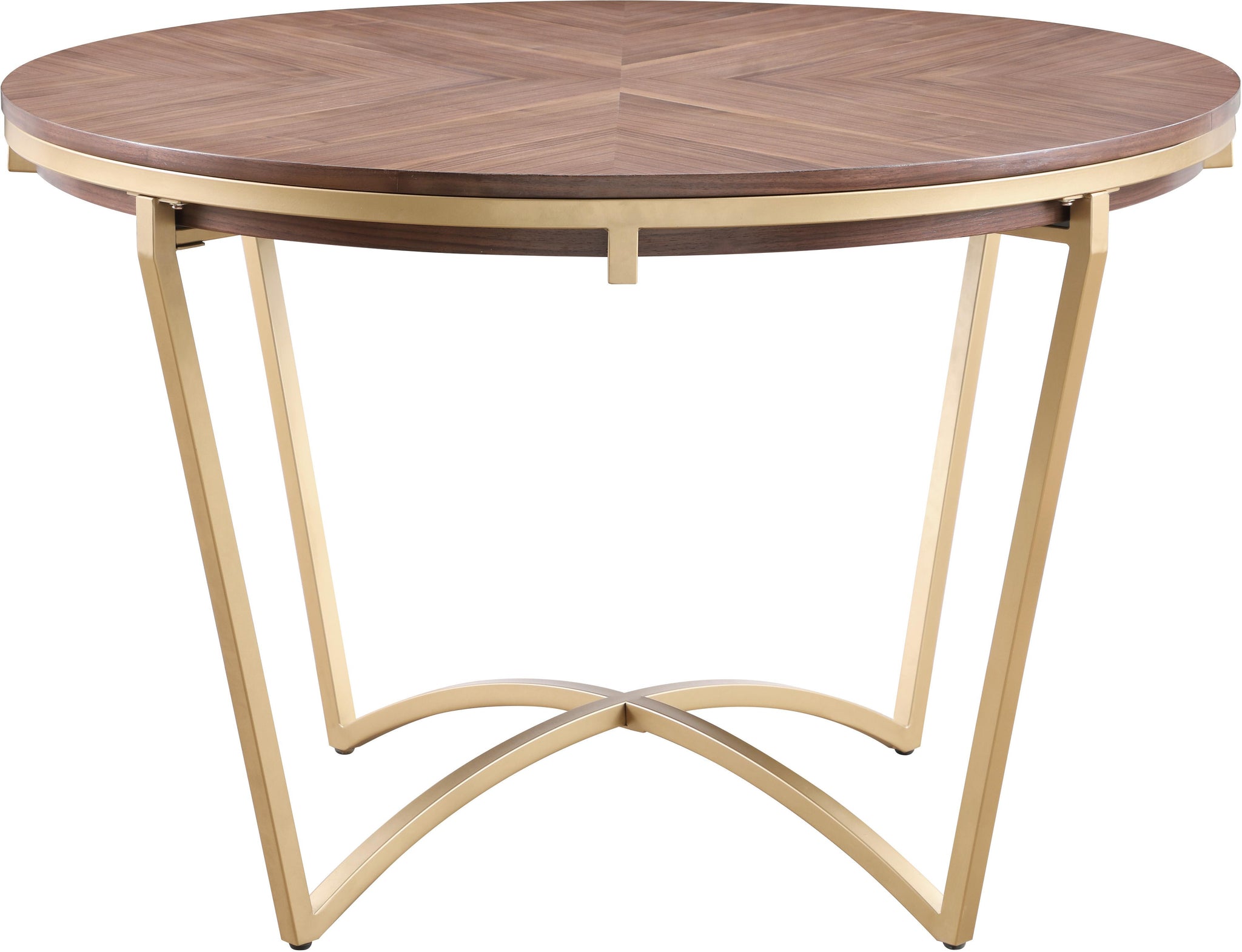Blend traditional with modern when you bring this Eleanor dining table into your space. This table catches the eye with its woodgrain natural walnut veneer top that rests sturdily on its brushed gold base. Offering legroom aplenty for your guests, this table provides a lovely contrast that is well at home in both modern and classic d?�cor settings. Pair your favorite chairs for a look that is hard to ignore.