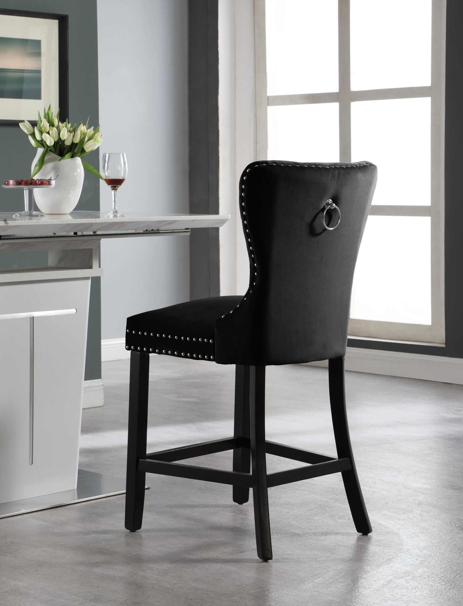 Lounge in luxurious style with the Nikki black velvet counter stool. Featuring a curved high back, plush cushioned seat and deep tufted black velvet upholstery studded with chrome nailheads, this counter stool is sure to take your dining experience to a whole new level. Espresso wood legs provide sturdy support and complement the stunning black upholstery for a sleek, contemporary design.