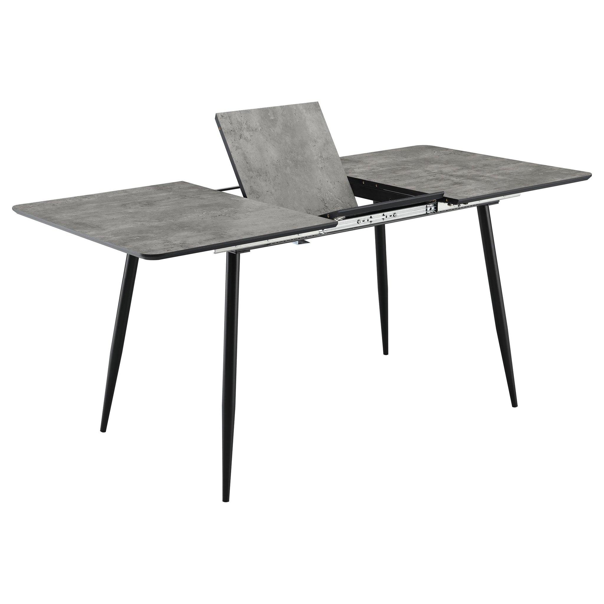This modern dining table features a sleek grey tabletop finish paired with black tapered legs, creating a sophisticated two-tone design. The table includes a 15. 75-inch butterfly leaf, extending its length from 47. 25 to 63 inches, perfect for accommodating guests or everyday meals. Crafted with HD melamine paper over MDF, the tabletop is scratch- and water-resistant for lasting durability. Supported by black powder-coated metal legs, this table combines contemporary style with functional versatility.