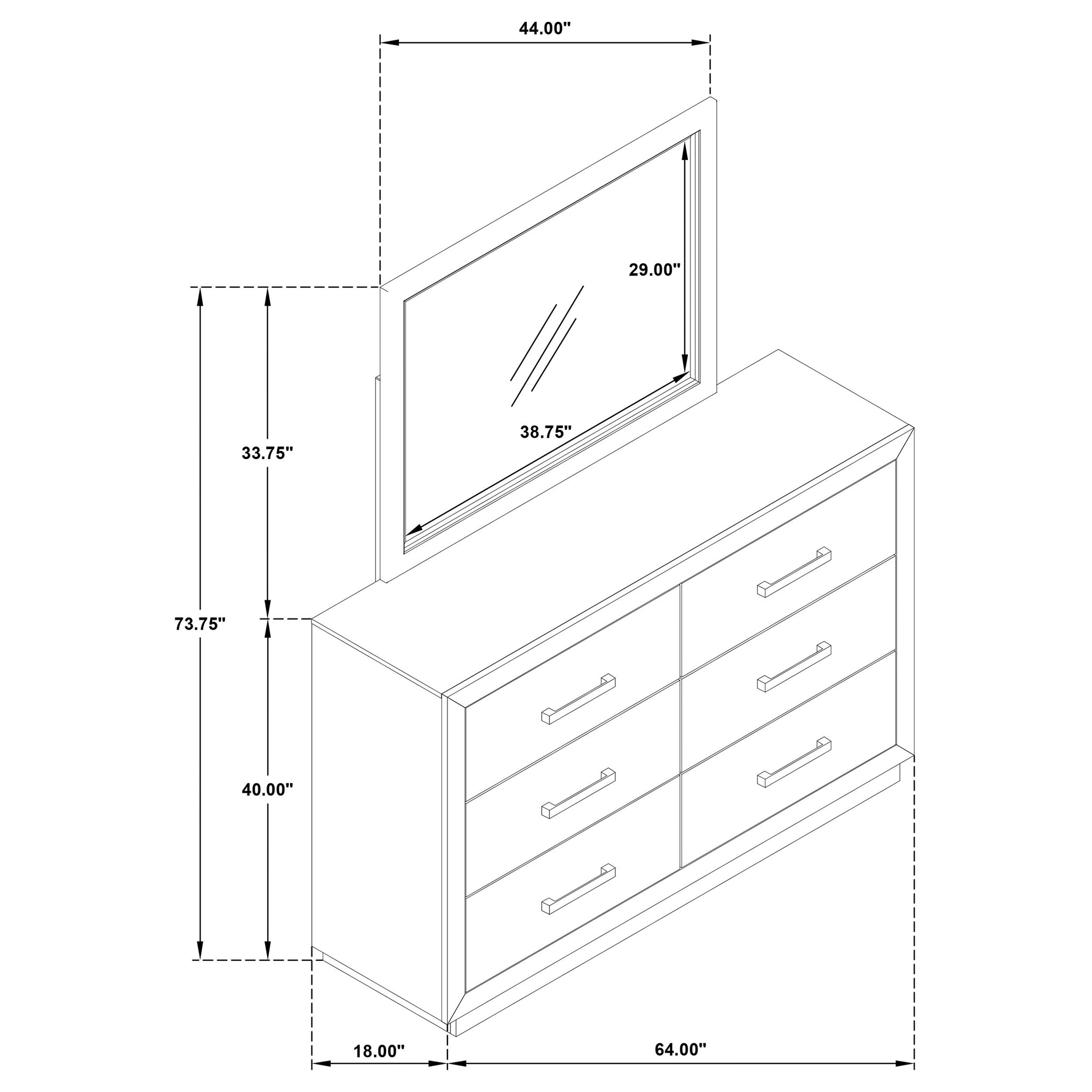 Put a timeless spin on bedroom decor with the refined flair of this modern six-drawer dresser. Designed for neutral appeal that blends into surrounding decor, it features a barley brown wood grain finish. Six drawer fronts are embellished with chrome finish bar pulls for a cohesive look with a touch of texture and depth. The dresser is augmented with a framed mirror on top, creating reflectivity in your bedroom and a spot for styling your daily looks. Add a jewelry box or valet and a bit of decor for a personal touch. Key Features: • Augment your bedroom with the easy, stylish storage featured in this modern six-drawer dresser • Barley brown finish is soft and neutral, offering a fresh palette for the decor of your choice • Six drawers of equal size provide ample storage for clothing, accessories and linens • Mitered trim adds dimension while chrome finish bar pulls complete the look • Recessed base lightens the look while a wide top with a framed mirror is ideal for personal decor