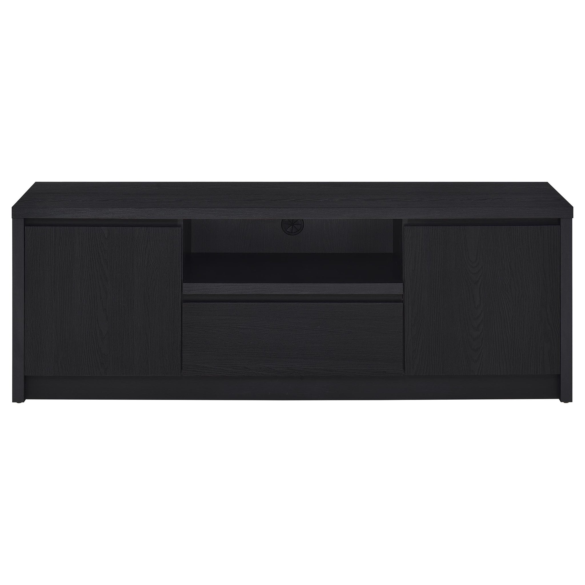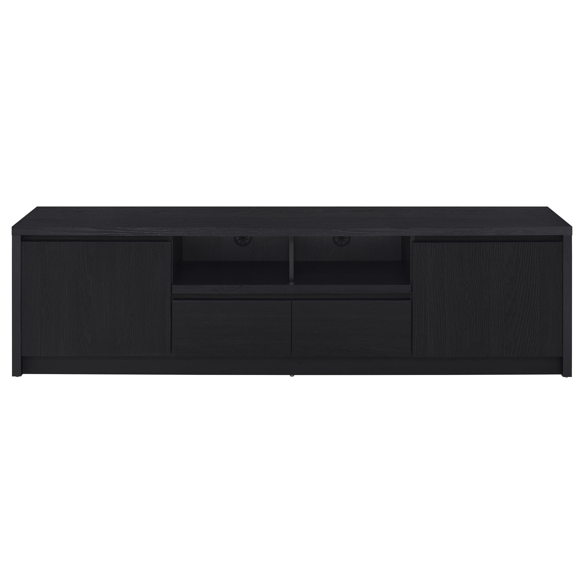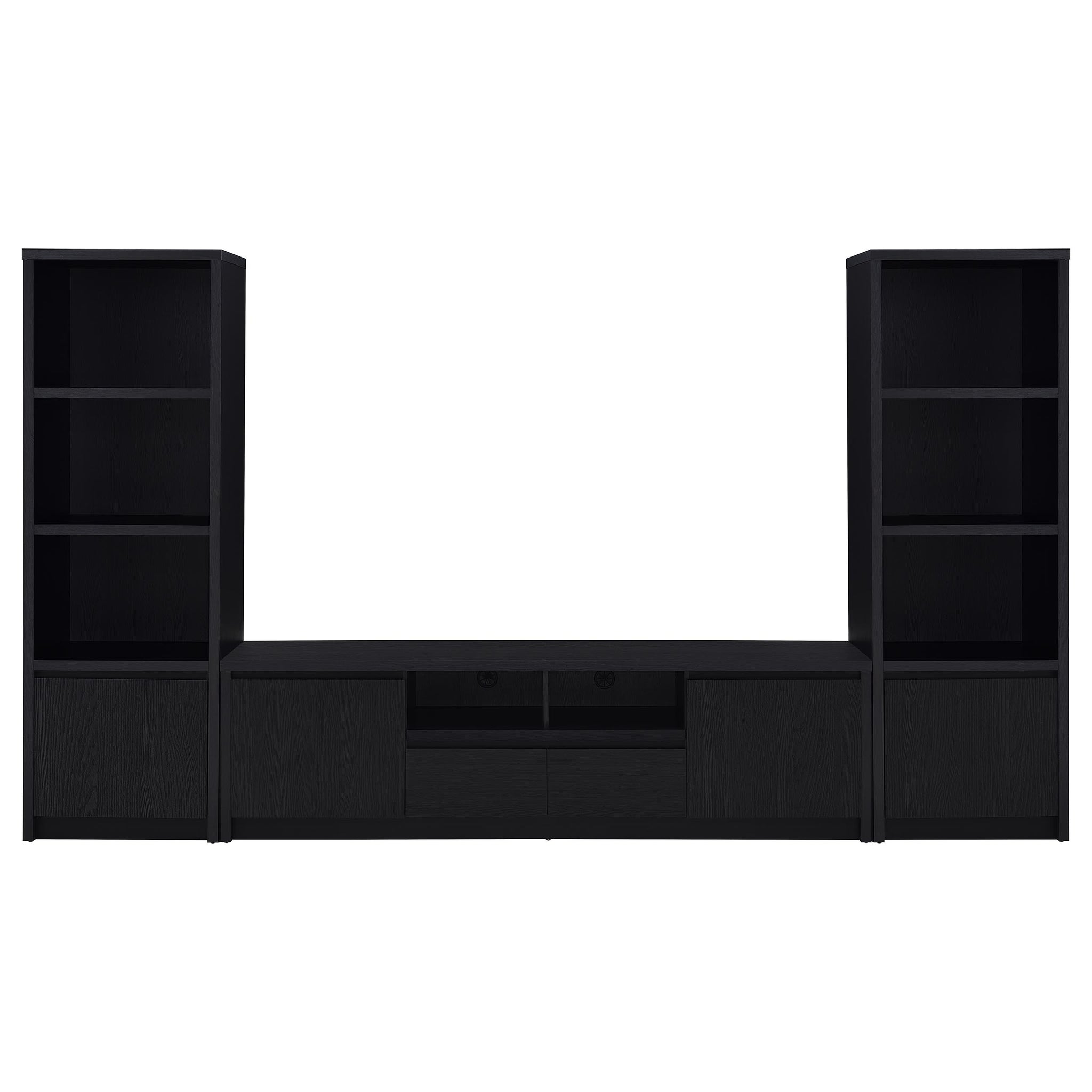 This modern entertainment center combines a sleek TV stand with two matching media towers, offering style and functionality. Finished in a bold black with a scratch-resistant eco-friendly laminate veneer, this unit provides ample storage and display options. The TV stand features cabinets, an open shelf with cable management, and a wide drawer, while each media tower includes open shelves and a bottom cabinet for organized storage. Perfect for creating a cohesive entertainment space in any living room. Key Features: • Contemporary entertainment center with a 65-inch TV stand and two media towers • Bold black finish with scratch-resistant, eco-friendly laminate veneer • Compact TV stand includes two cabinets, an open shelf with cable management, and a central drawer • Media towers provide three open shelves and a bottom cabinet for storage flexibility • Durable engineered wood construction provides stability for smaller spaces • Perfect solution for maximizing organization in a modern living room