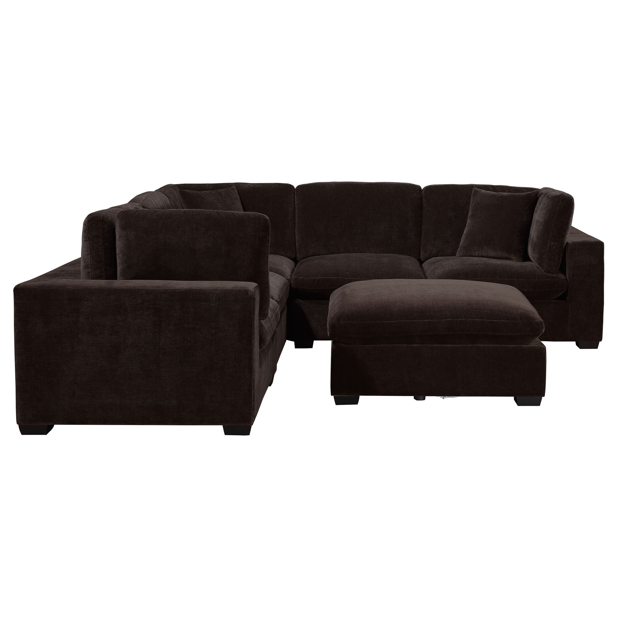 Sink into comfort with a modern, modular sectional sofa with an included ottoman. Plush cushions create exceptional comfort and support, wonderful for lounging or catching up with friends. The sectional displays an on-trend silhouette complete with wide track arms and block feet. The velvety soft upholstery is the perfect choice for a family room, creating a cozy ambiance. Its color palette is modern and versatile, easily complementing a variety of spaces and surrounding decor motifs.