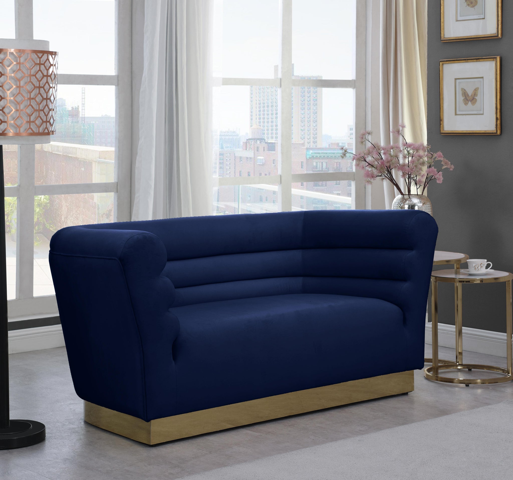 Add a bit of pizzazz to your living space with this Bellini Navy Velvet Loveseat from Meridian Furniture. Rich navy velvet upholstery offers you a luxurious place to curl up with a good book or rest in front of the TV after a long day, while horizontal channel tufting creates texture and style. Its gold stainless steel base provides solid support, while adding to the loveseat's contemporary appearance. Its uniquely curved shape makes this piece a perfect addition to any room in your modern home.