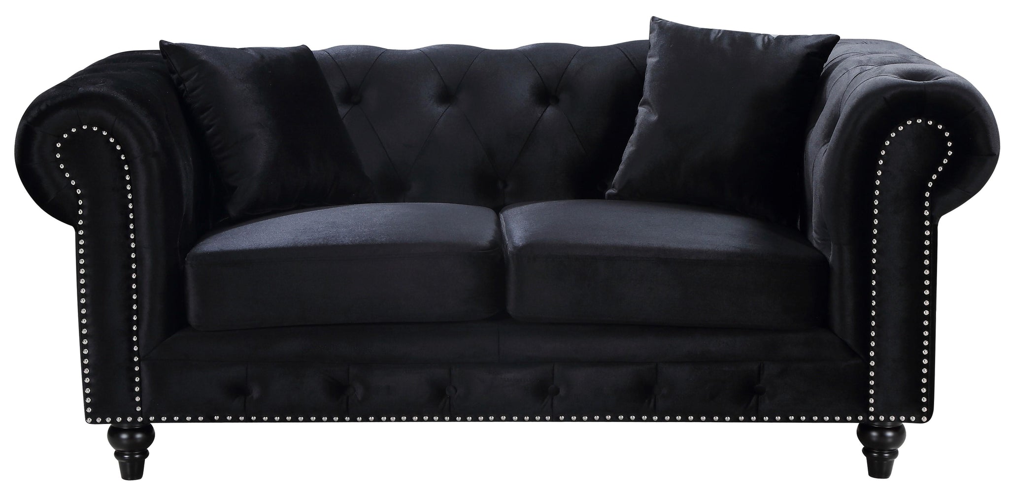 Elegant and eye-catching, the stunning Chesterfield Living Room from Meridian Furniture is the perfect addition to any space. Rich Velvet covers the plush, comfortable seat, padded with high-density foam and modern tufted design. Strength and beauty is guaranteed with a solid wood frame and legs. Features a nail head design on the arms and includes matching throw pillows.