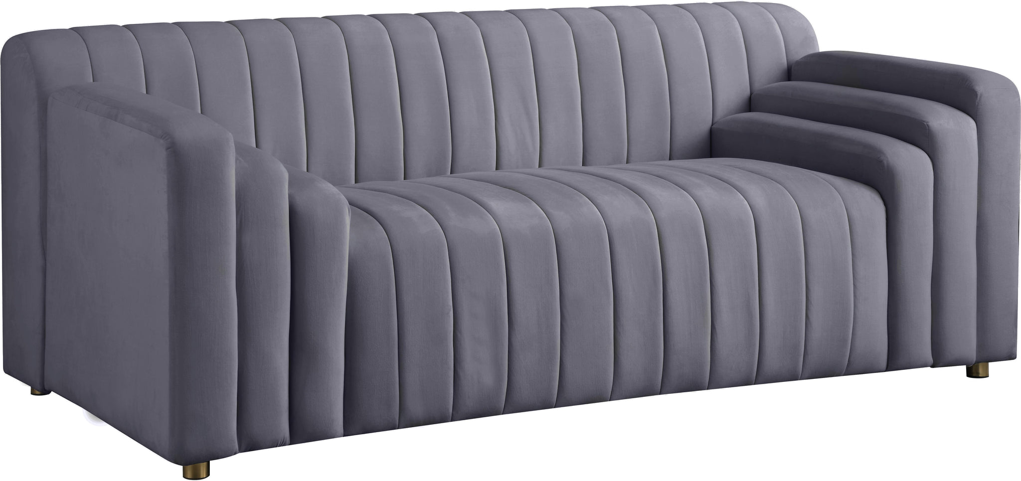 Express your bold, contemporary side with this Naya velvet love seat. This handsome piece is upholstered in grey velvet and blends seamlessly with the other units in the Naya collection, or it looks equally as beautiful on its own. Deep channel tufts run the length of the back, arms and seats of this unit, ensuring its exceptional comfort while giving it a decidedly modern vibe.
