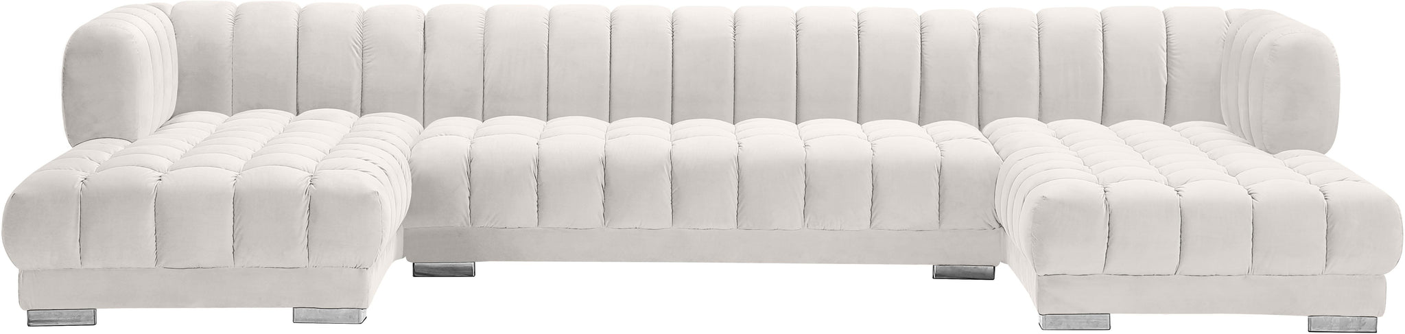 Settle in for family game night atop this Gwen velvet sectional that���s upholstered with soft cream velvet material. This 3-piece sectional has a lot to offer, with its deep seating and extra wide design that gives you oodles of room to move around and get comfy. The tufted design of the arms, back, and seats adds to their durability and soft, welcoming touch. The sectional comes with two sets of legs in both gold and chrome to mesh nicely with other elements in your room.