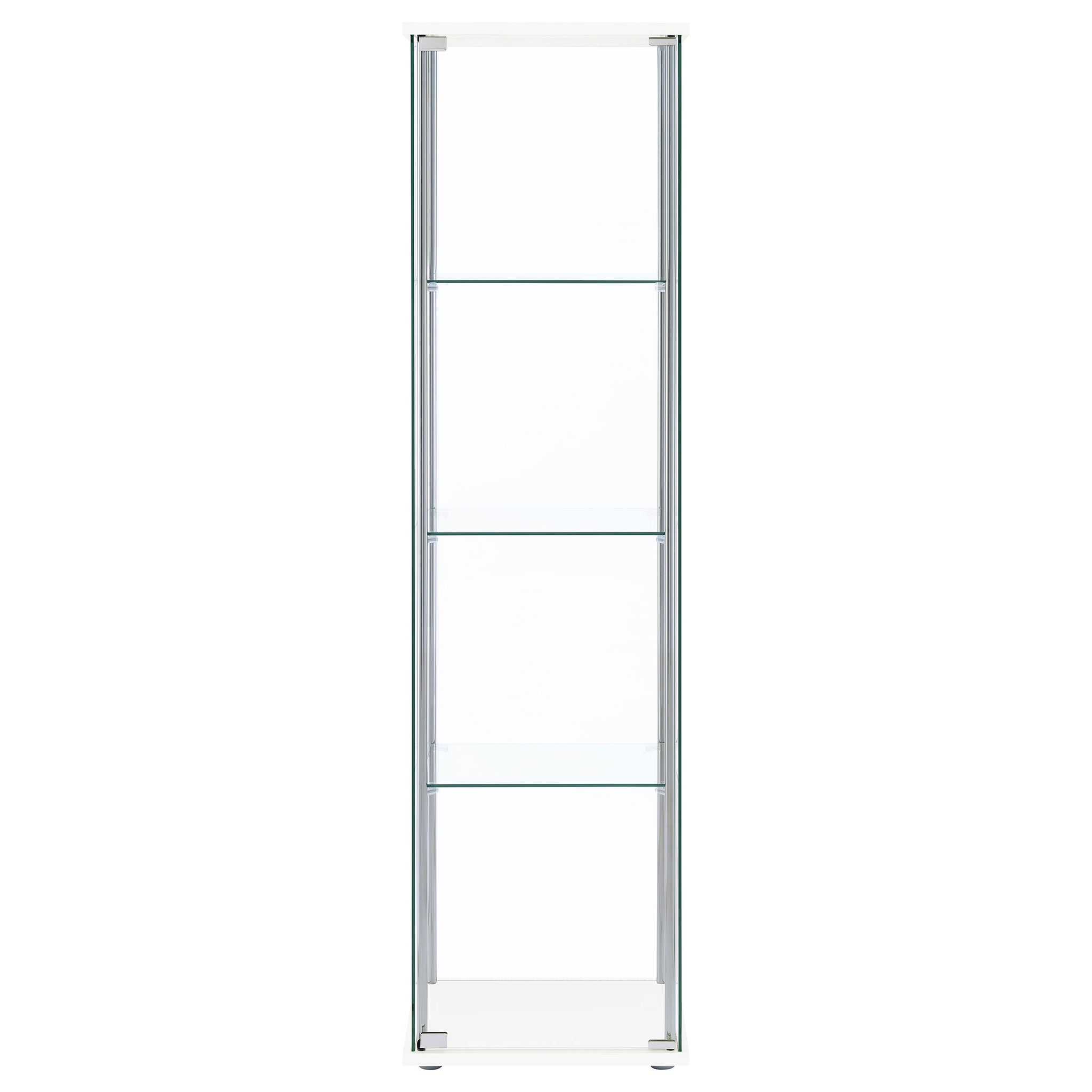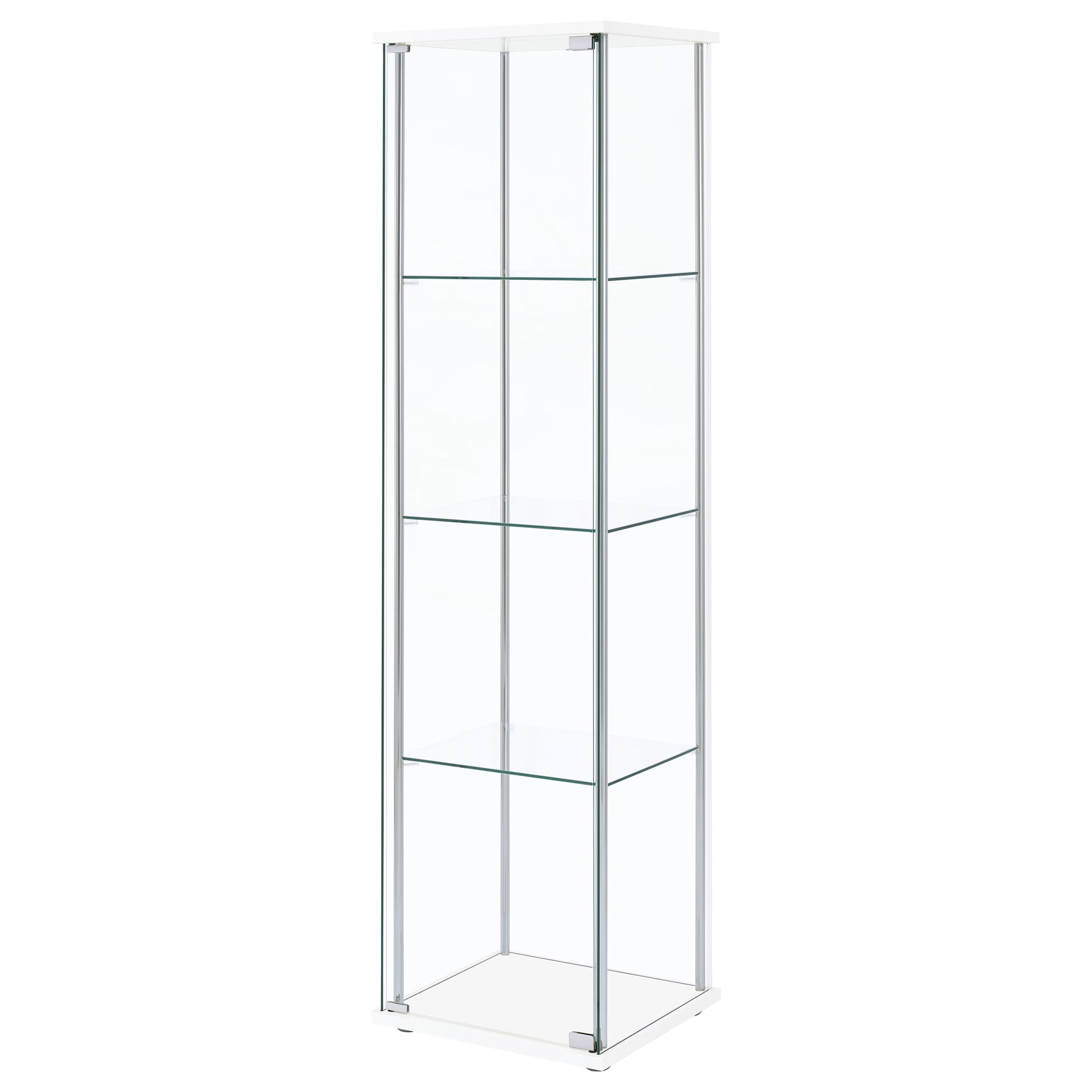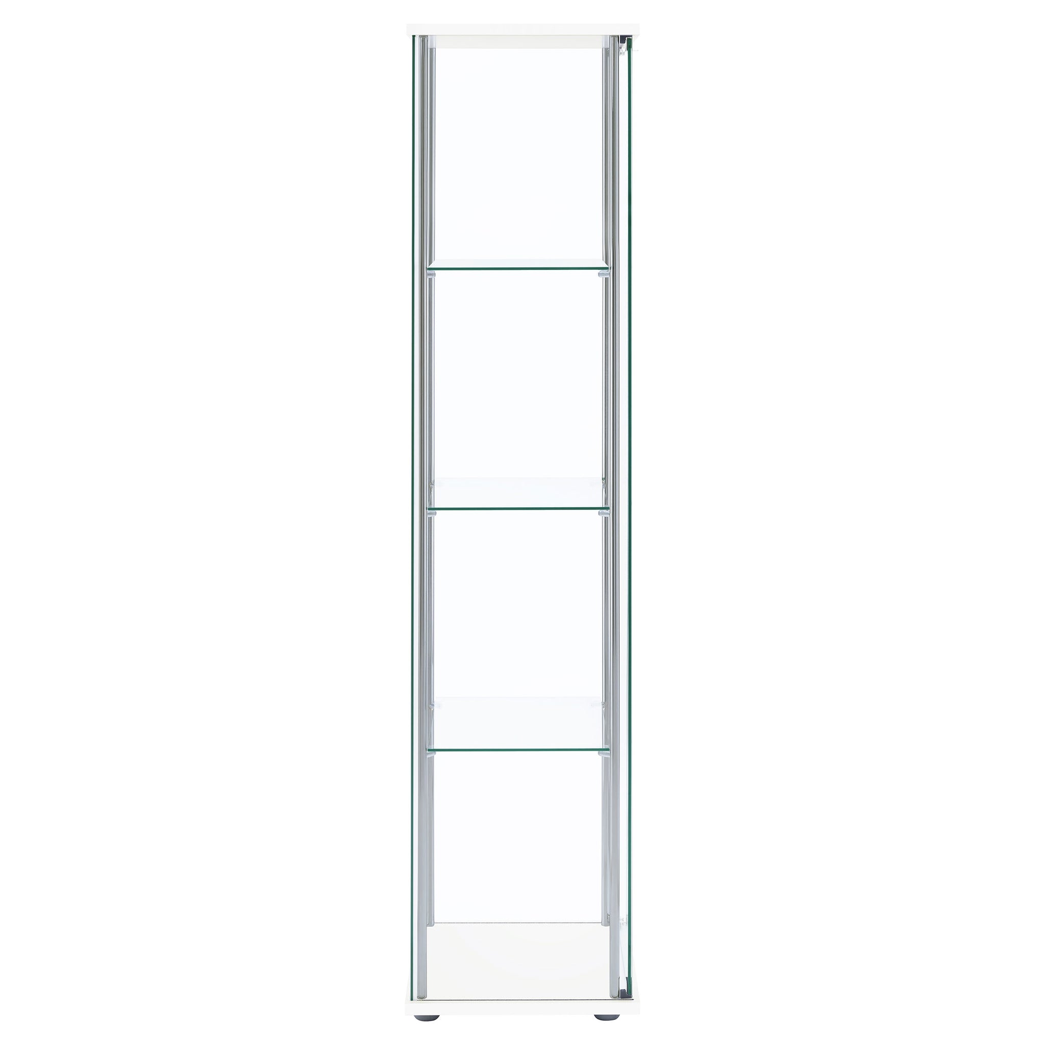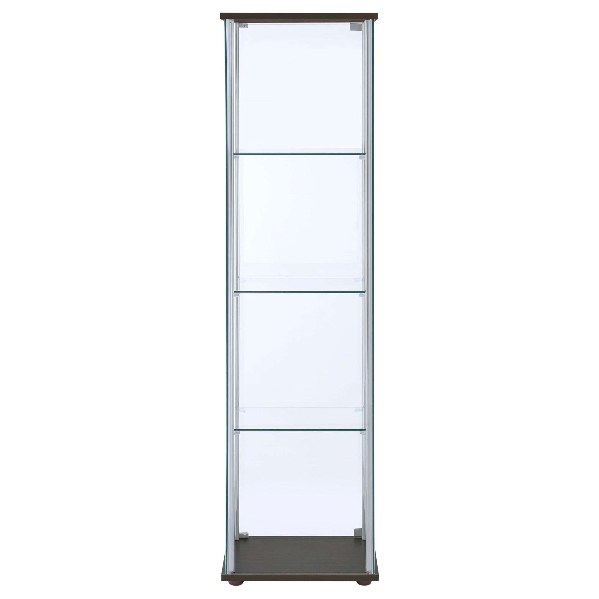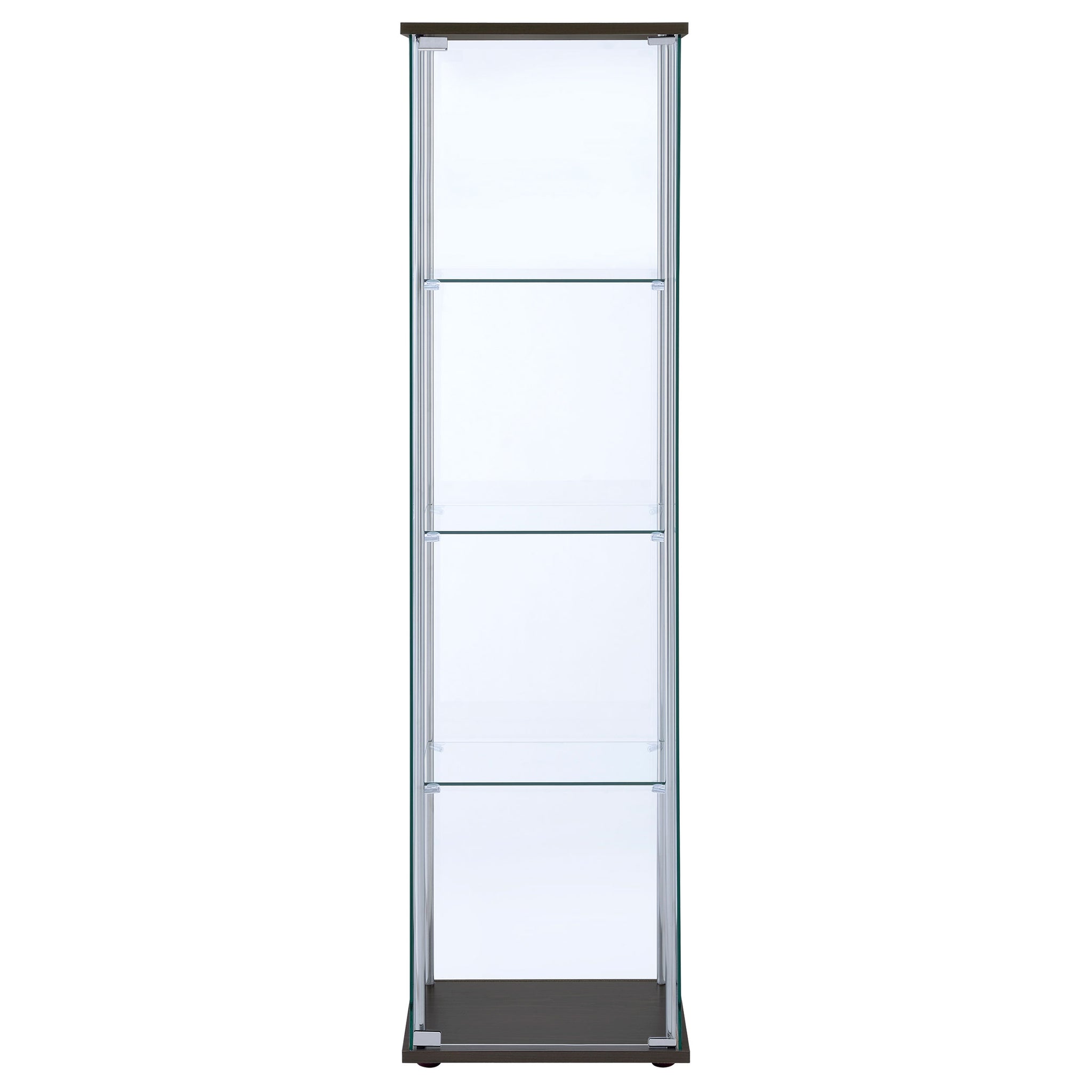 This curio cabinet blends modern simplicity with timeless display function, offering a tall, streamlined silhouette. Clear tempered glass panels and three sturdy shelves create an airy showcase for treasured keepsakes. Chrome tone supports frame the design with contemporary flair, while a rectangular top and base add subtle stability. Crafted with glass, engineered wood, and laminate veneer, this cabinet serves as both storage and statement in living or dining spaces. Key Features: • Curio cabinet with cappuccino base and top, four shelf design, chrome supports, clear glass • Cappuccino finish curio cabinet, rectangular top and base, chrome supports, tempered glass • Four shelf curio cabinet in cappuccino, clear tempered glass shelving, chrome metal accents • Cappuccino finished base with chrome support beams, three tempered glass shelves, tall frame • Modern cappuccino curio cabinet with chrome details, engineered wood base, tempered glass door • Cappuccino tone cabinet with chrome structure, laminate veneer base, three glass shelves inside