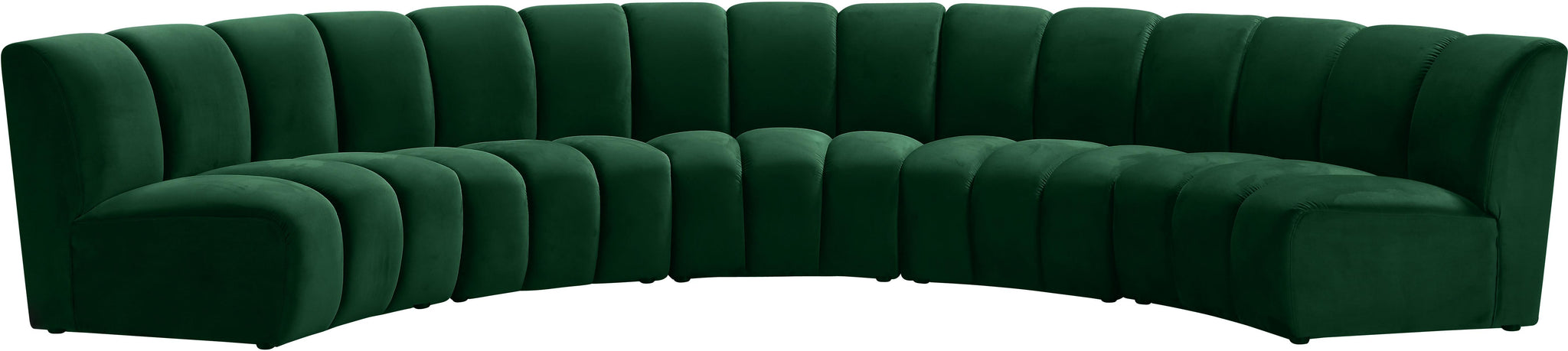 Create a seating group that works for every possible situation with this Infinity modular 5-piece sectional and other pieces in the Infinity collection. Upholstered in soft green velvet material that feels great against the skin and offers long-wearing beauty, this piece fits with other Infinity items for an infinite number of combinations that get your seating requirements just right but that look just as nice when used on their own.