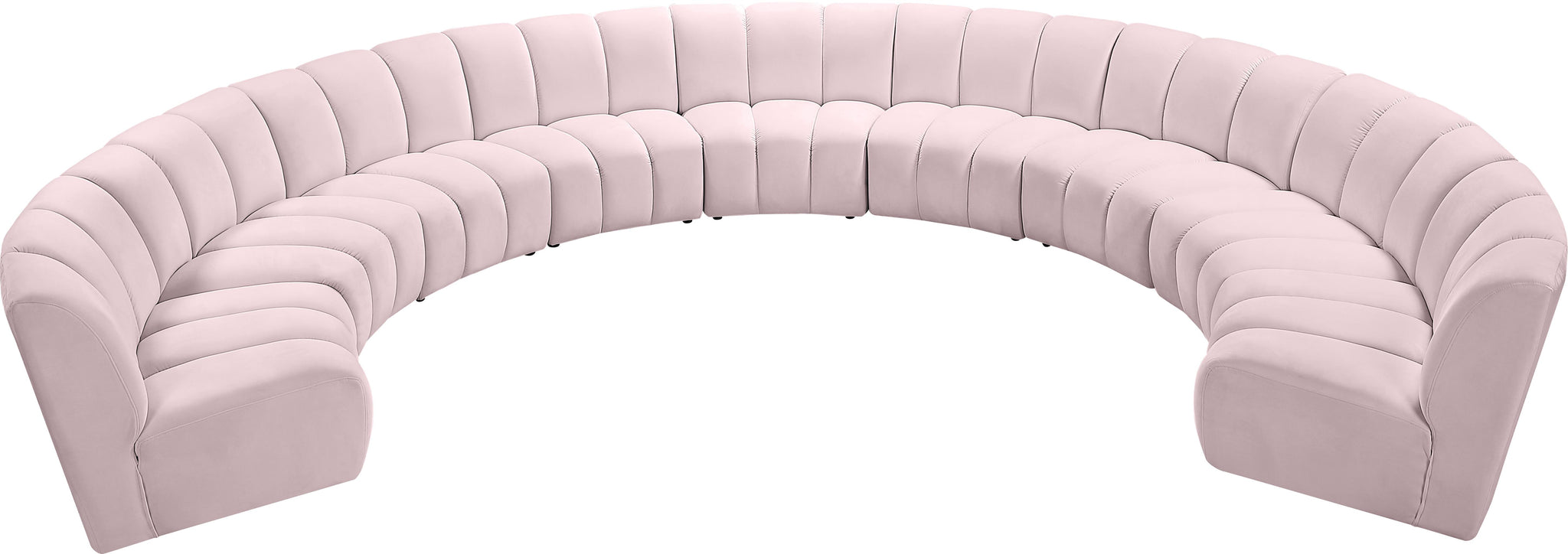 Create a seating group that works for every possible situation with this Infinity modular 9-piece sectional and other pieces in the Infinity collection. Upholstered in soft pink velvet material that feels great against the skin and offers long-wearing beauty, this piece fits with other Infinity items for an infinite number of combinations that get your seating requirements just right but that look just as nice when used on their own.
