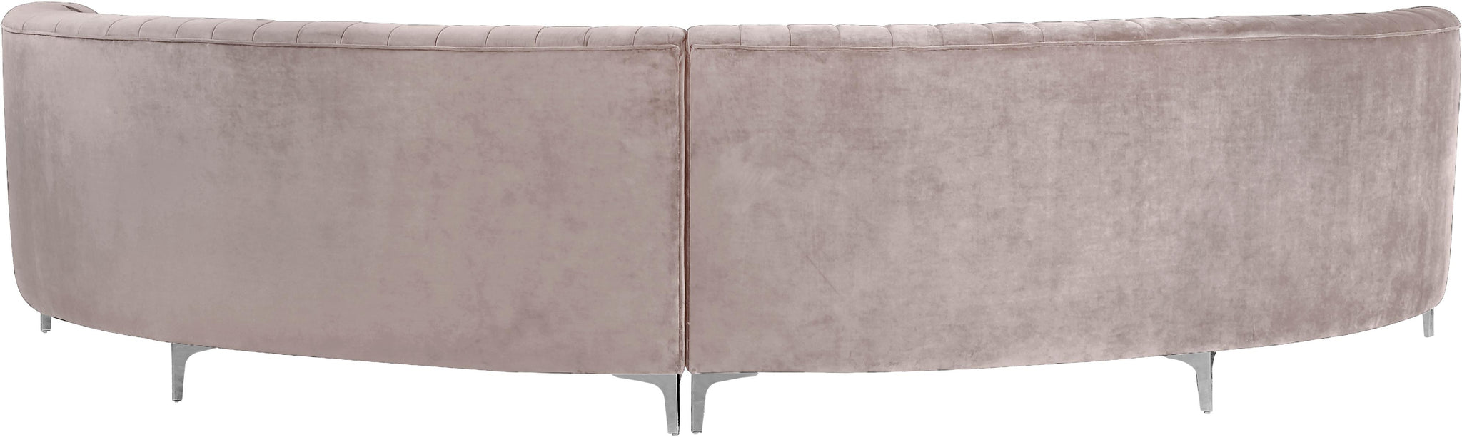 Give your living room a modern upgrade with this contemporary pink velvet Jackson two-piece sectional sofa. Its channel tufting design adds texture to its plush pink velvet upholstery, creating a resting piece that is pleasing to the senses. Its lengthy, curved design provides ample space for you to stretch out, or cuddle up with your family. Complete sets of gold and chrome legs are included so you can customize this sectional to suit your existing decor.