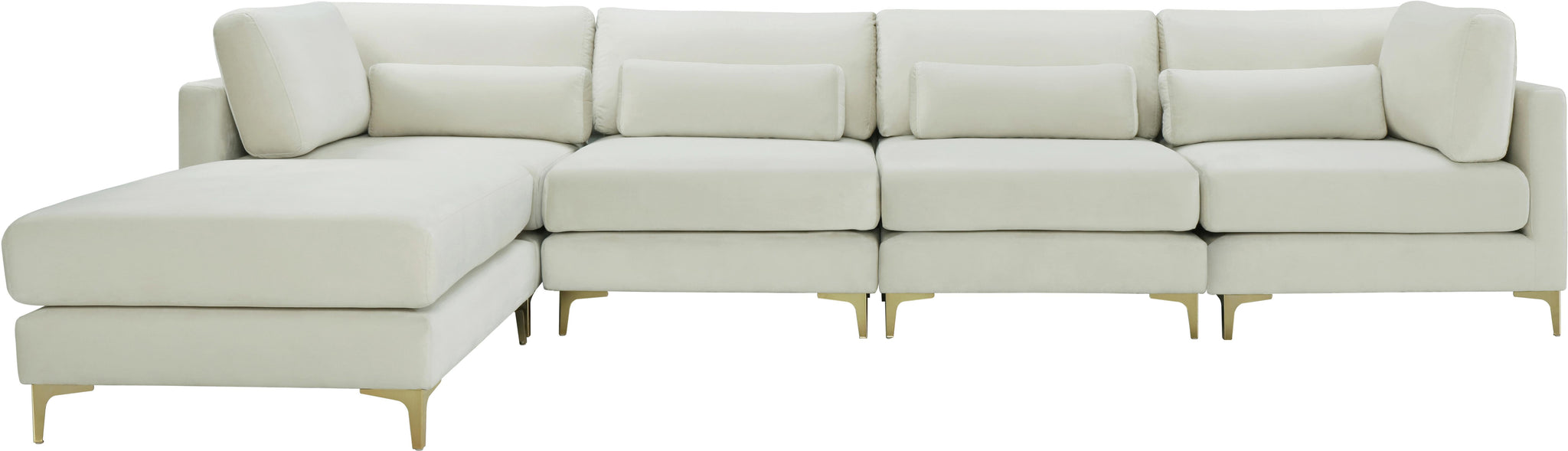 Ready to get cozy? Curl up from the welcoming confines of this Julia velvet modular sectional and you can do just that! Its soft cream velvet upholstery is soft and supple to the skin, coaxing you to relax, unwind, and sit for a spell. It comes with both gold and chrome legs for a customizable and contemporary finish. Pair this Julia piece with others to form an infinite number of seating configurations to meet your particular decorative desires and space requirements.