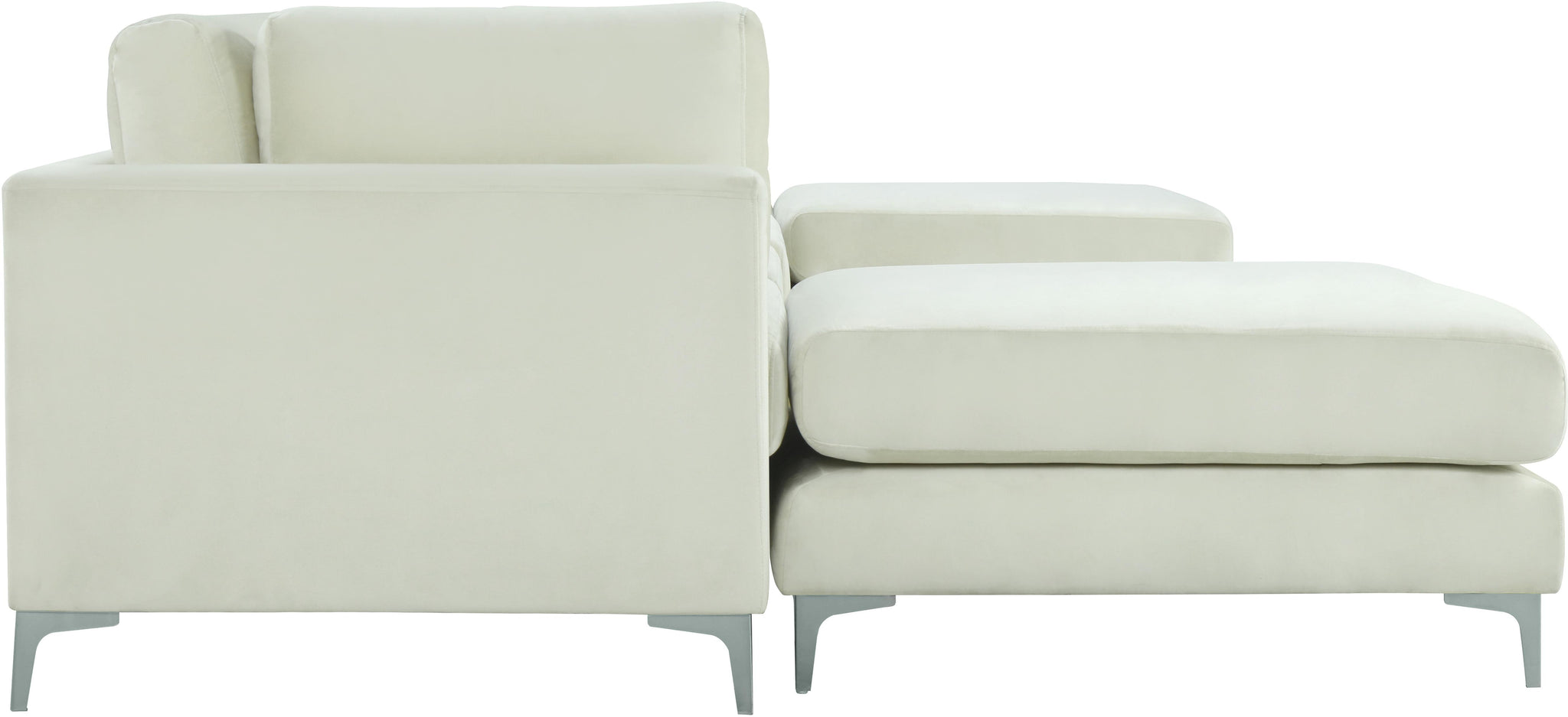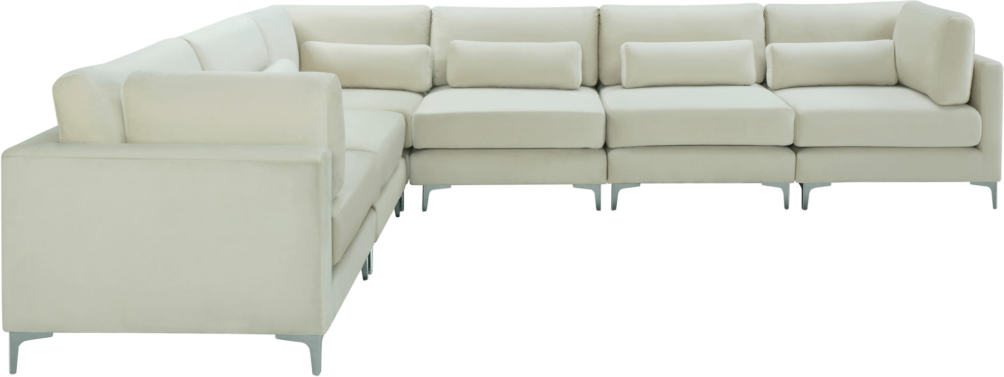 Ready to get cozy? Curl up from the welcoming confines of this Julia velvet modular sectional and you can do just that! Its soft cream velvet upholstery is soft and supple to the skin, coaxing you to relax, unwind, and sit for a spell. It comes with both gold and chrome legs for a customizable and contemporary finish. Pair this Julia piece with others to form an infinite number of seating configurations to meet your particular decorative desires and space requirements.